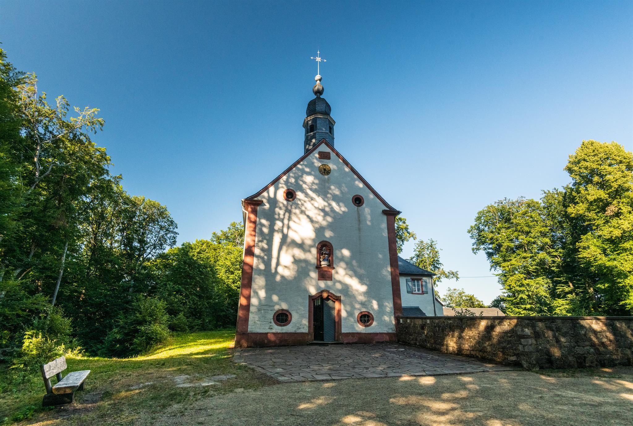 Die Schankweiler Klause ist Start und Ziel der Wanderung Klausnerweg im NaturWanderPark delux. Ein Wanderparkplatz befindet sich etwas entfernt vom Gelände der Kirche und der Klausnerwohnung.