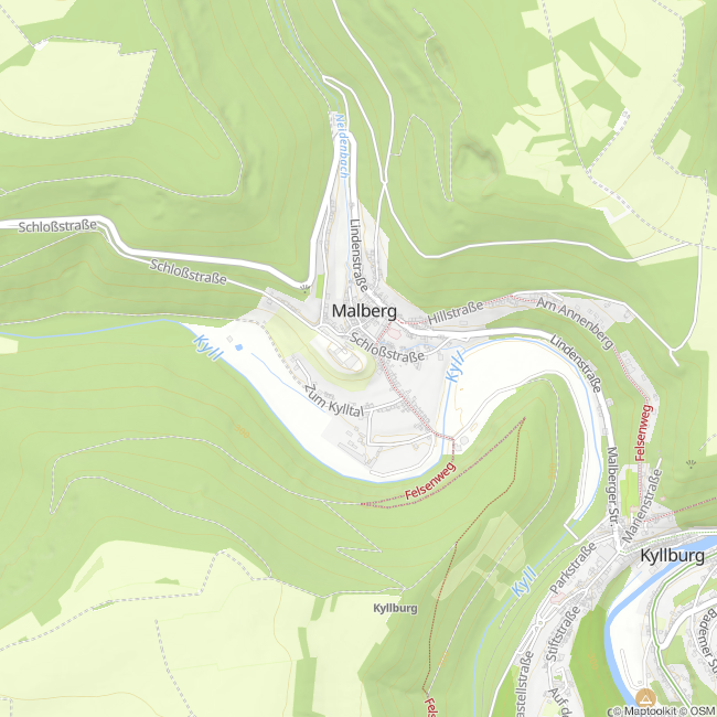 Die einzigartige Schlossanlage Malberg besteht aus dem sogenannten Neuen Haus, dem Alten Haus, dem Arkadenbau, der Brauerei und der Kapelle. Weiter gehören der "Eiserne Garten" und der "Runde Garten" zu dem auf einem Bergsporn gelegenen Schloss. Das Schloss Malberg geht auf eine Burg zurück, die schon im Jahre 1008 erwähnt wird. Von dem mittelalterlichen Bau ist nichts erhalten. 1681 übernimmt die Familie Veyder die Burg und läßt sie von 1708 bis 1715 durch Matteo Alberti, einem Architekten aus Venedig, zu einem Schloss im Stil des venezianischen Barock ausbauen. Die repräsentativen Gebäude enthalten Stuckdecken und Holztäfelungen sowie Gobelins und alte Möbel. Einzigartig ist eine bemalte Wandbespannung mit Jagdszenen. Im Schloss kann man sich standesamtlich trauen lassen. Das Schloss ist nicht barrierefrei. Hunde sind im Schloss nicht erlaubt.