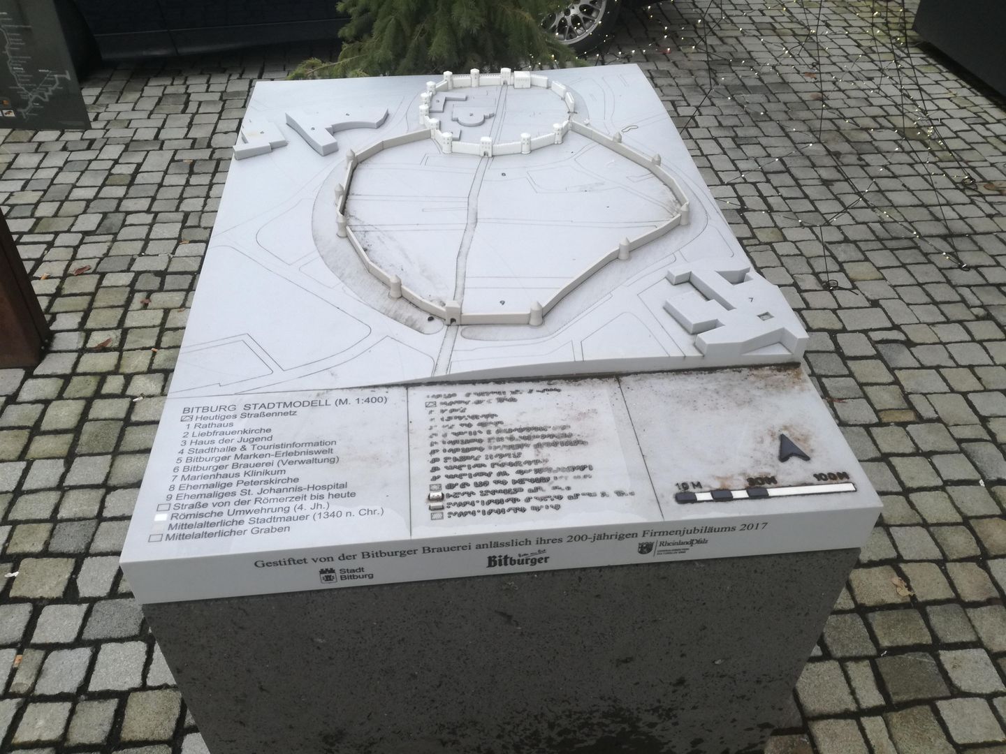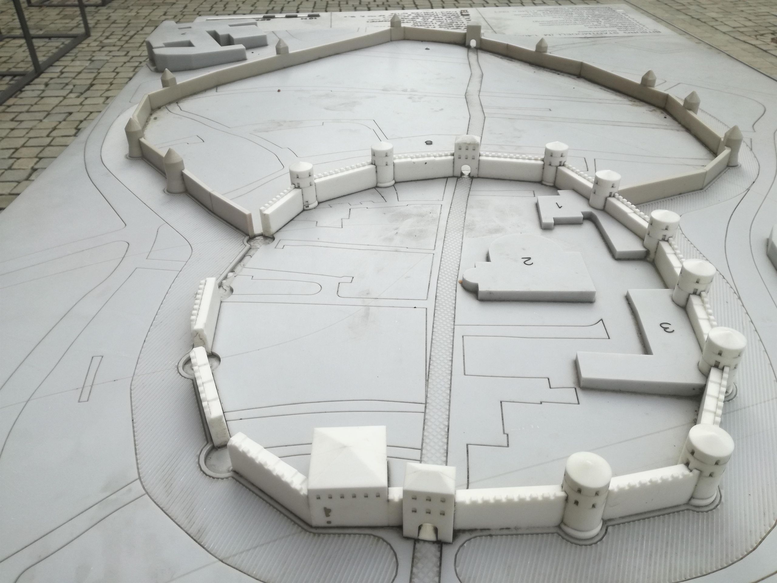 Das Modell aus dem Werkstoff Corian zeigt die verschiedenen Entwicklungsstadien der Stadt - vom römischen Straßendorf zur spätrömischen Befestigung bis hin zur mittelalterlichen Stadt. Es steht in der Fußgängerzone in unmittelbarer Nähe der Liebfrauenkirche.