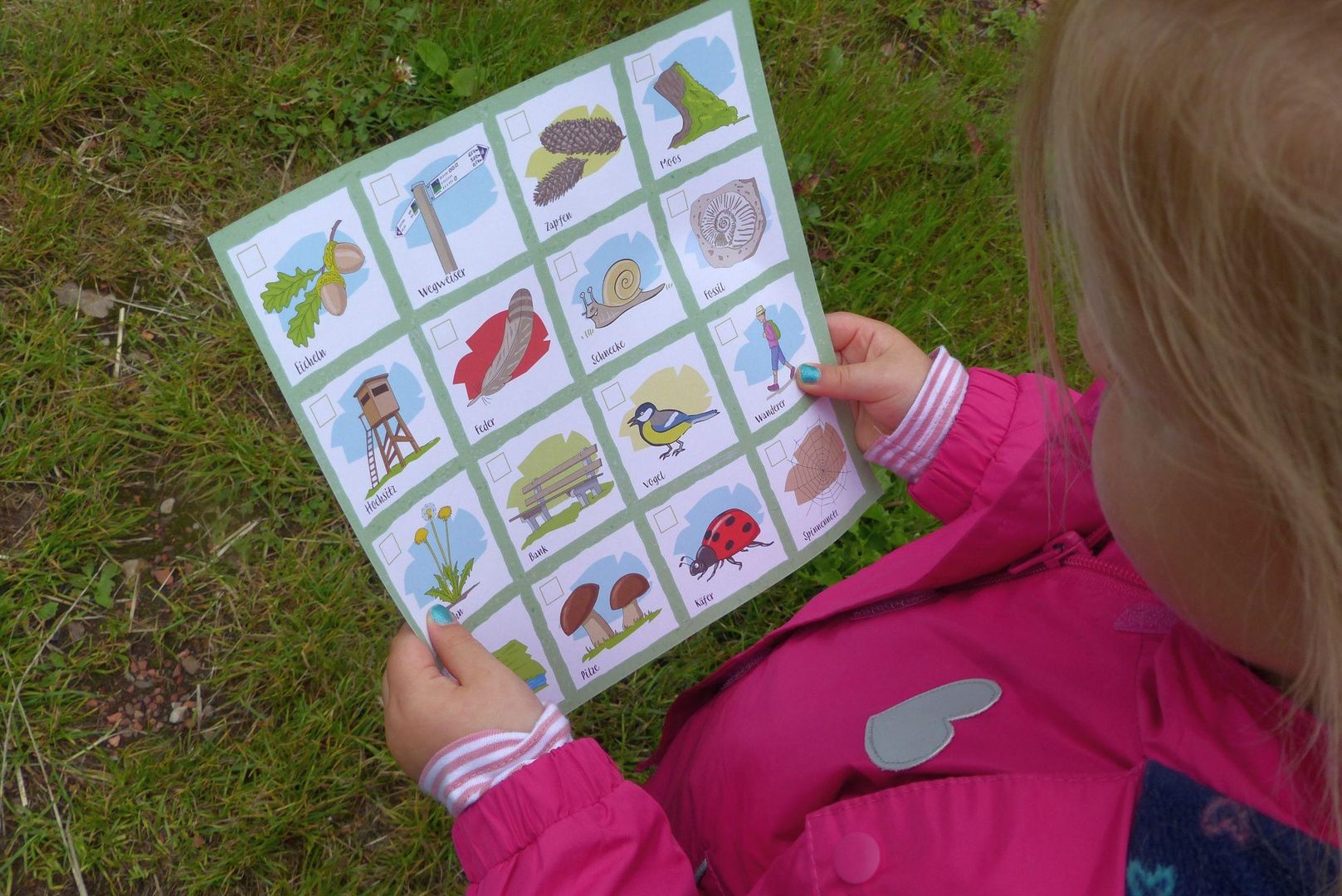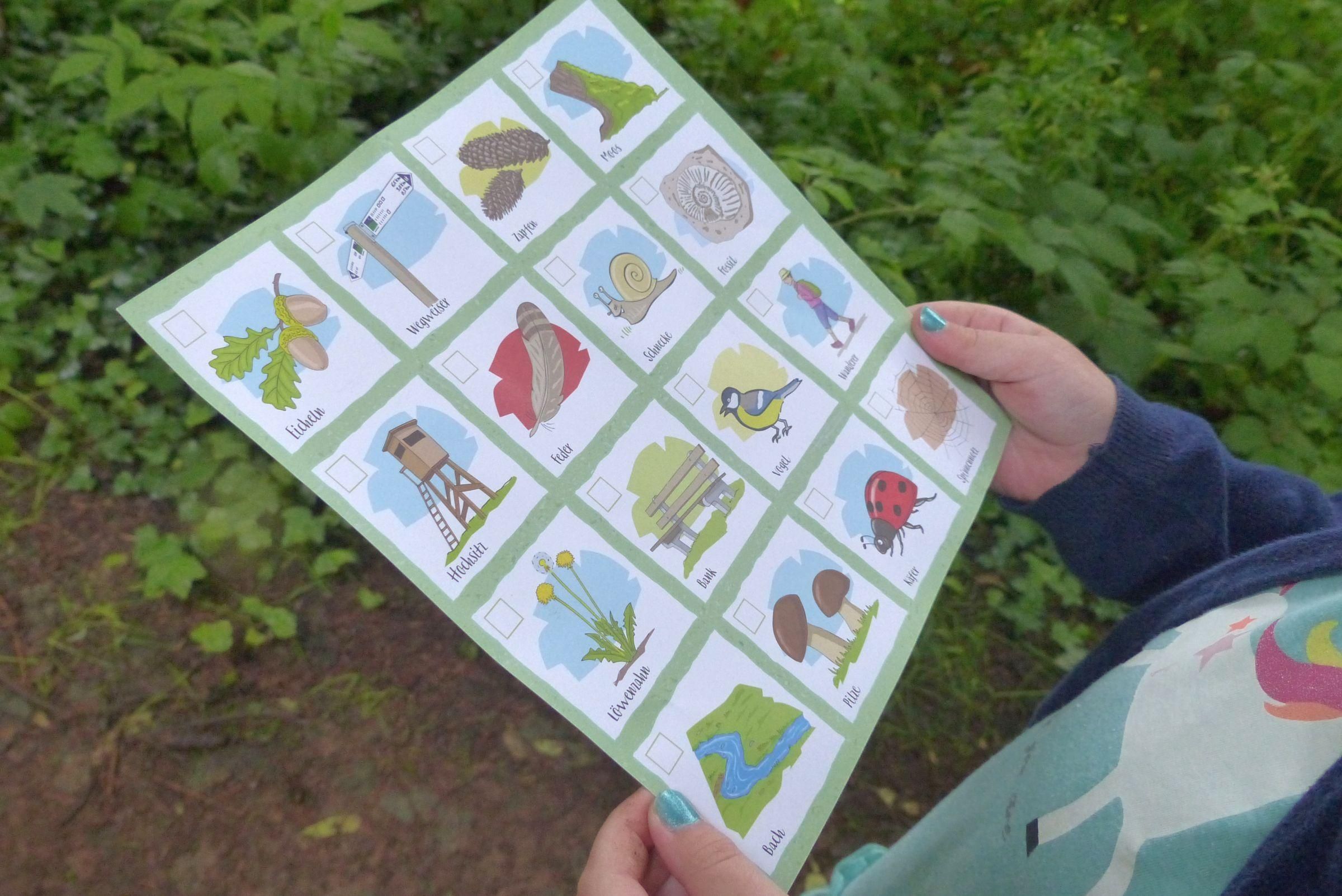 Wandern muss für Kinder nicht langweilig sein. Durch Wälder und Felder lässt sich die Natur spielerisch entdecken. Wer findet zuerst vier der gesuchten Dinge, die diagonal, vertikal oder horizontal eine Linie bilden und gewinnt damit das Spiel? Bach, Bank, Schnecke, Moos – Bingo!