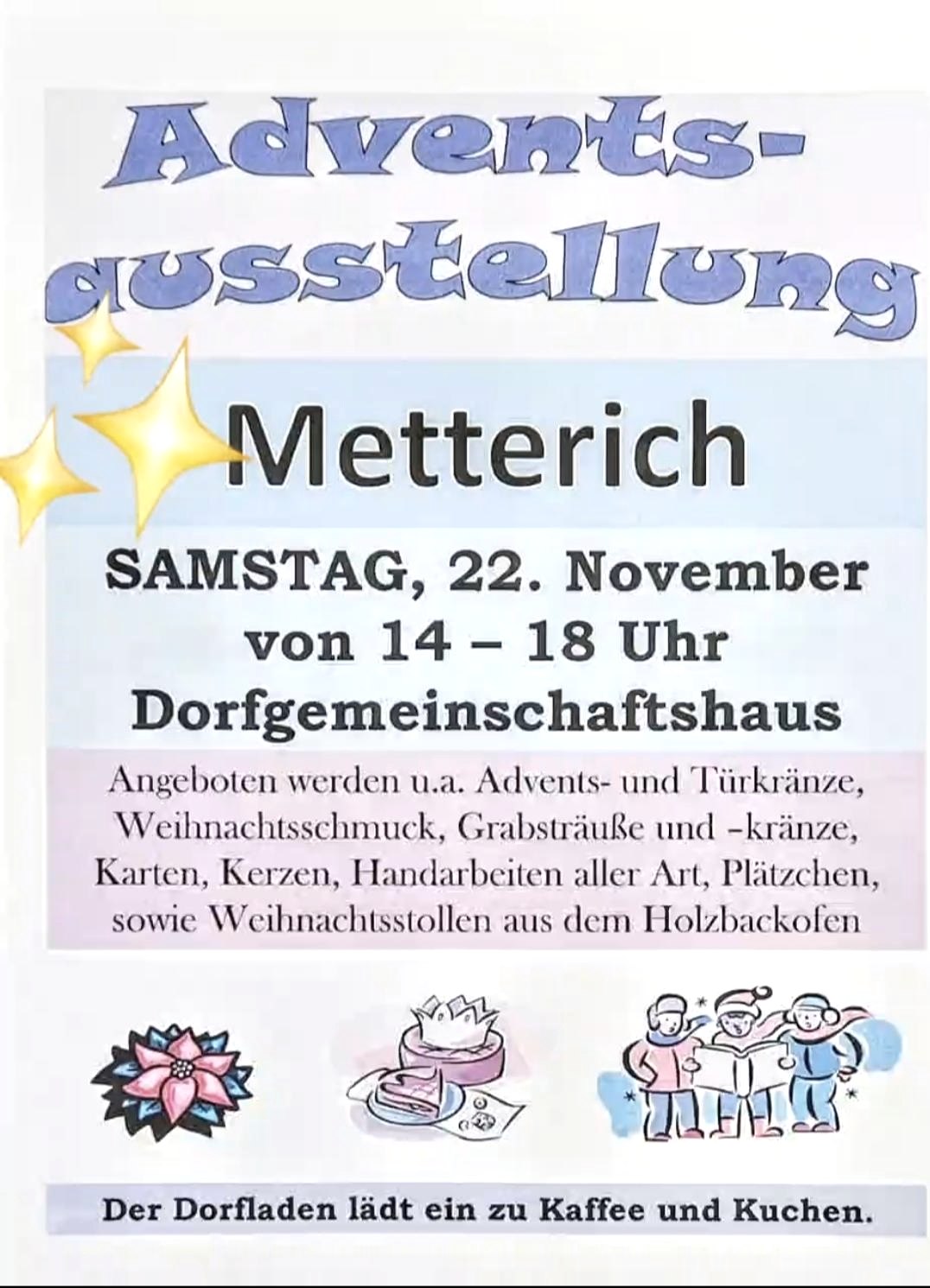 Am Samstag, 22. November fndet in Metterich im Dorfgemeinschaftshaus ab 14 Uhr die jährliche Adventsausstellung statt. Angeboten werden nur selbst gebastelte Artikel, u. a. Advent- und Türkränze, Weihnachtsschmuck, Grabsträuße oder -kränze, Kerzen, Filzdeko, gebrannte Mandeln, Plätzchen und Weihnachtsstollen aus dem Holzbackofen.