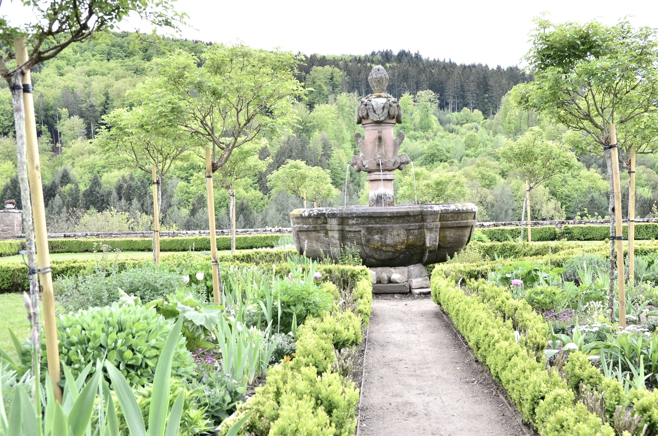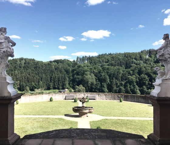 Um 1730 wurde durch den Bau der Stützmauer und massiver Aufschüttungen dem Neubau ein Garten vorgelegt. Der so genannte "Runde Garten" befindet auf der Südostseite der Schlossanlage und grenzt direkt an die prächtige Außenterrasse aus der gleichen Zeit an. Der Brunnen in der Mitte des halbkreisförmigen Gartens befand sich früher im Speisezimmer und war am Fensterpfeiler angebracht. Im Jahre 1777 ließ man ihn in den Garten versetzten und setzte ihm den Brunnenstock und die Schale auf. Das auf der Rückseite eingemeißelte Veydersche Wappen und die Jahreszahl zeugen noch heute von dieser Umsetzaktion.