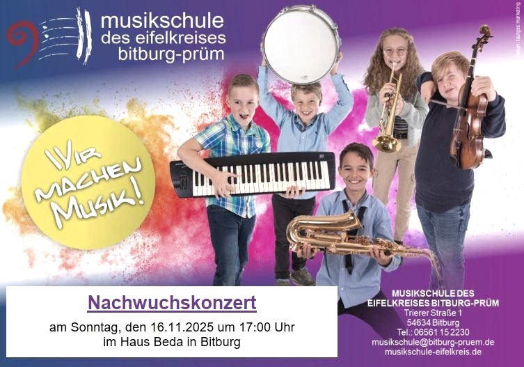 Am Sonntag, 16. 11.25 um 17:00 Uhr setzt die Musikschule des Eifelkreises eine sehr lange Veranstaltungstradition fort. Seit den 1990er Jahren bietet die Musikschule jungen, talentierten und förderungswürdigen Schülerinnen und Schülern die Möglichkeit Bühnenerfahrung zu sammeln.