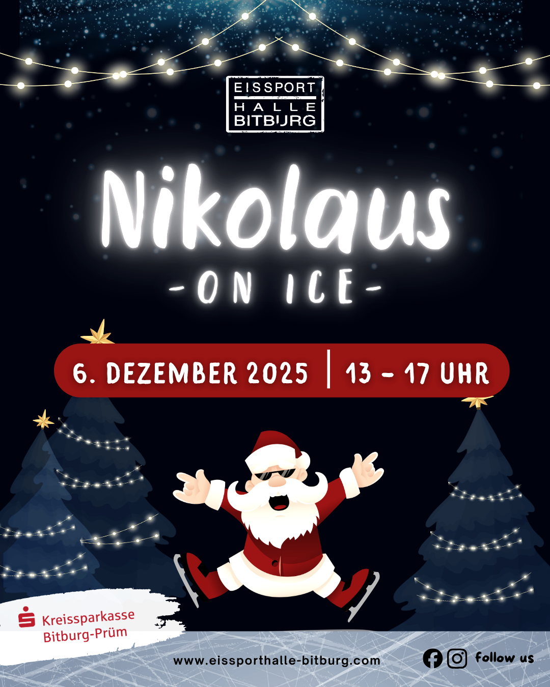 Am Samstag, 6. Dezember 2025, von 13 bis 17 Uhr habt ihr die Chance dazu – bei „Nikolaus on Ice“, präsentiert von der Kreissparkasse Bitburg-Prüm! Der Nikolaus gleitet übers Eis und verteilt Schoko-Nikoläuse an alle Besucher.