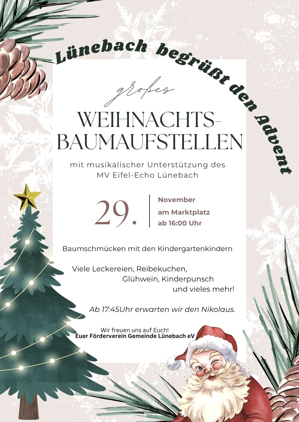 Der Förderverein Gemeinde Lünebach e.V. lädt herzlich ein zum großen Weihnachtsbaumaufstellen zur Begrüßung des Advents!