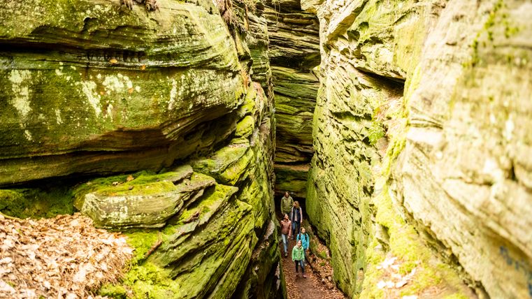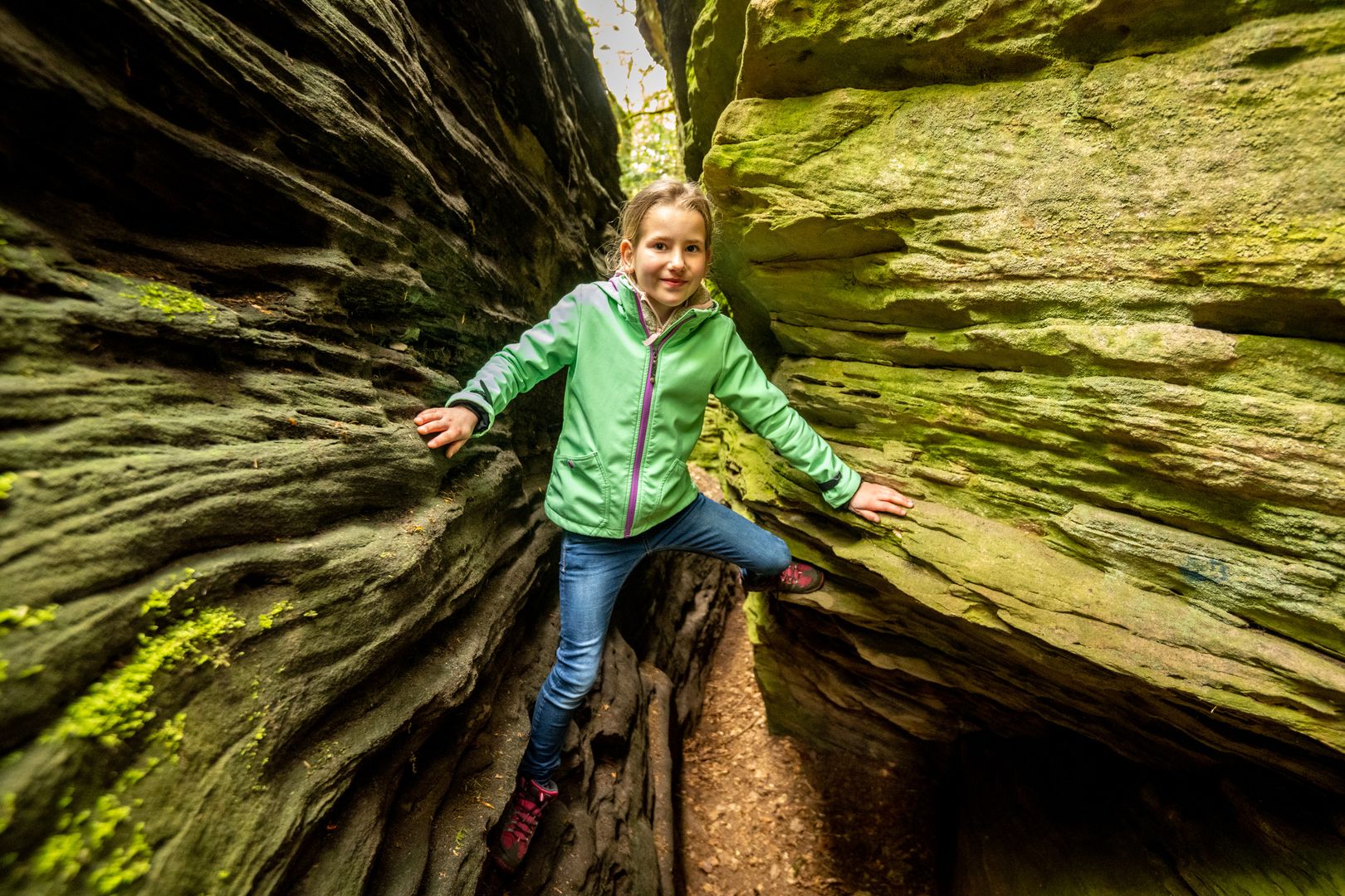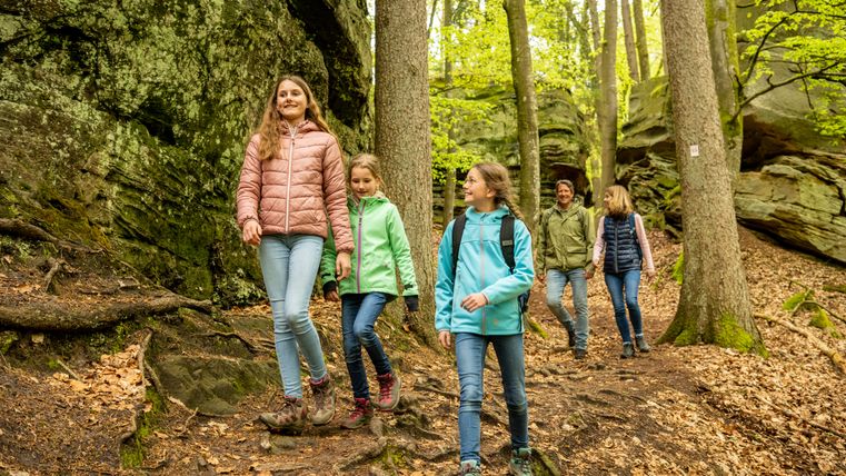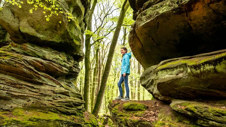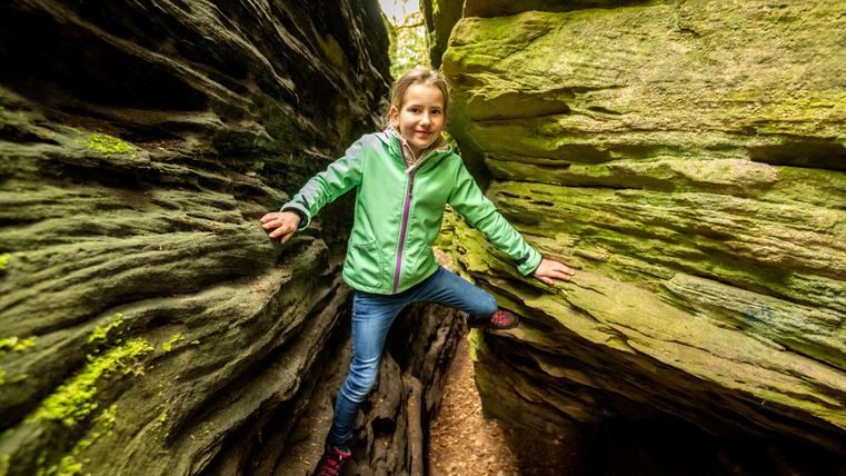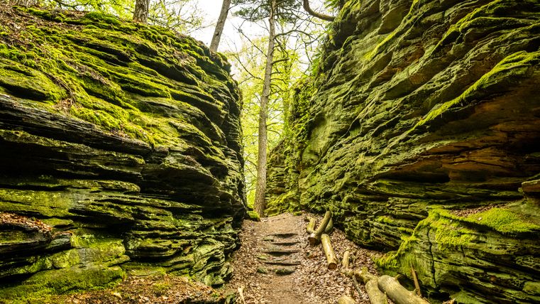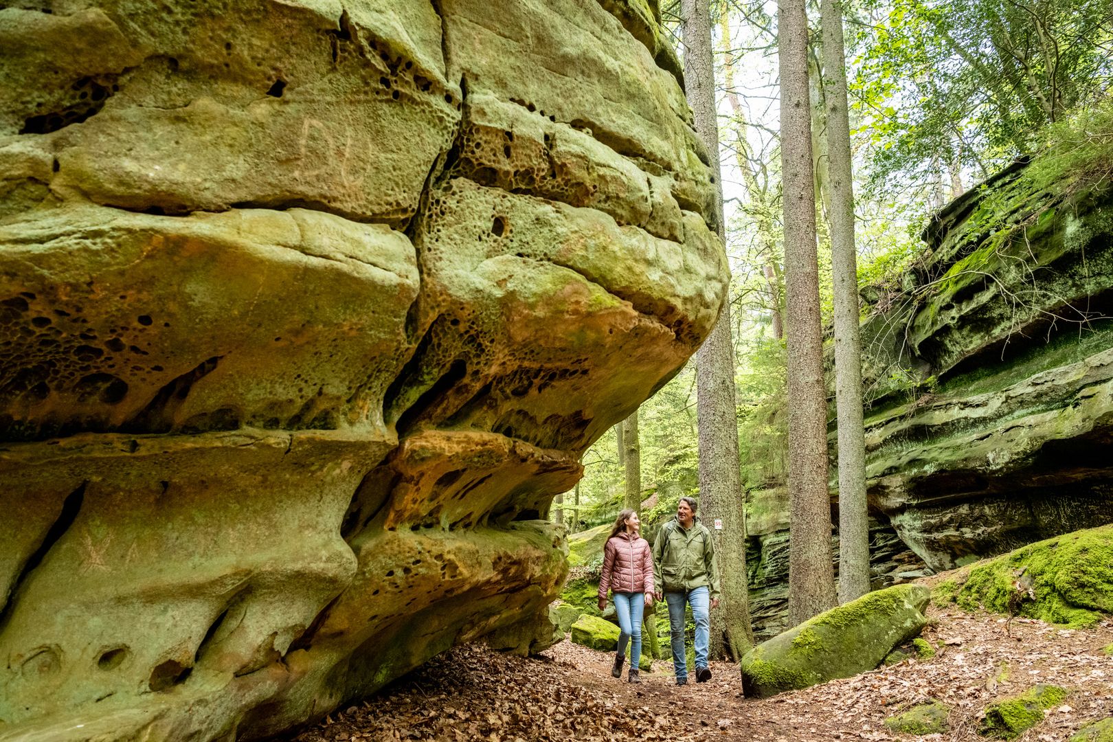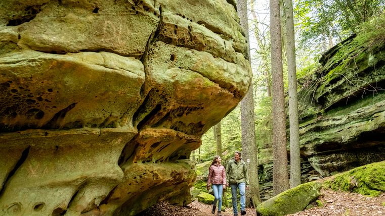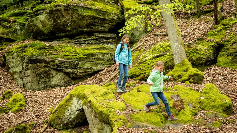 Namensgeber der Tour ist die "Grüne Hölle" eine der beeindruckenden Felsformationen der Südeifel. Zum Ende der letzten Eiszeit sind viele große und kleine Klüfte entstanden. Kaum ein Sonnenstrahl erhellt die Grüne Hölle. Sie ist so grün, weil der Sandstein Wasser aufsaugt wie ein Schwamm - beste Voraussetzungen für Moos, Algen und Flechten.