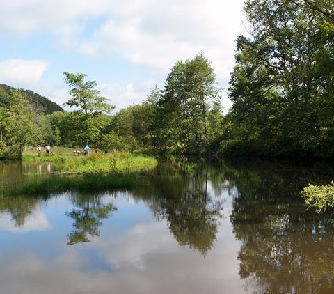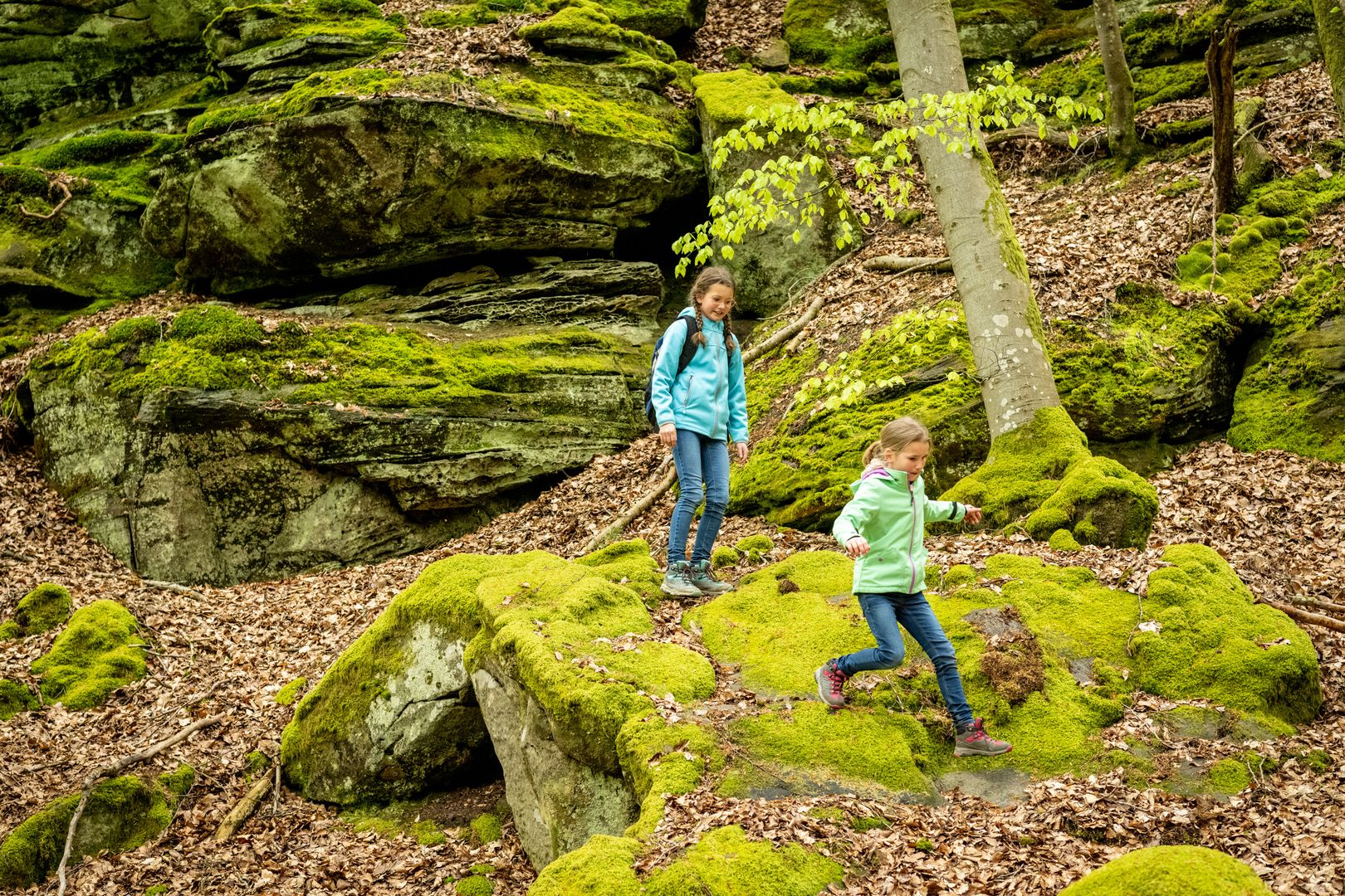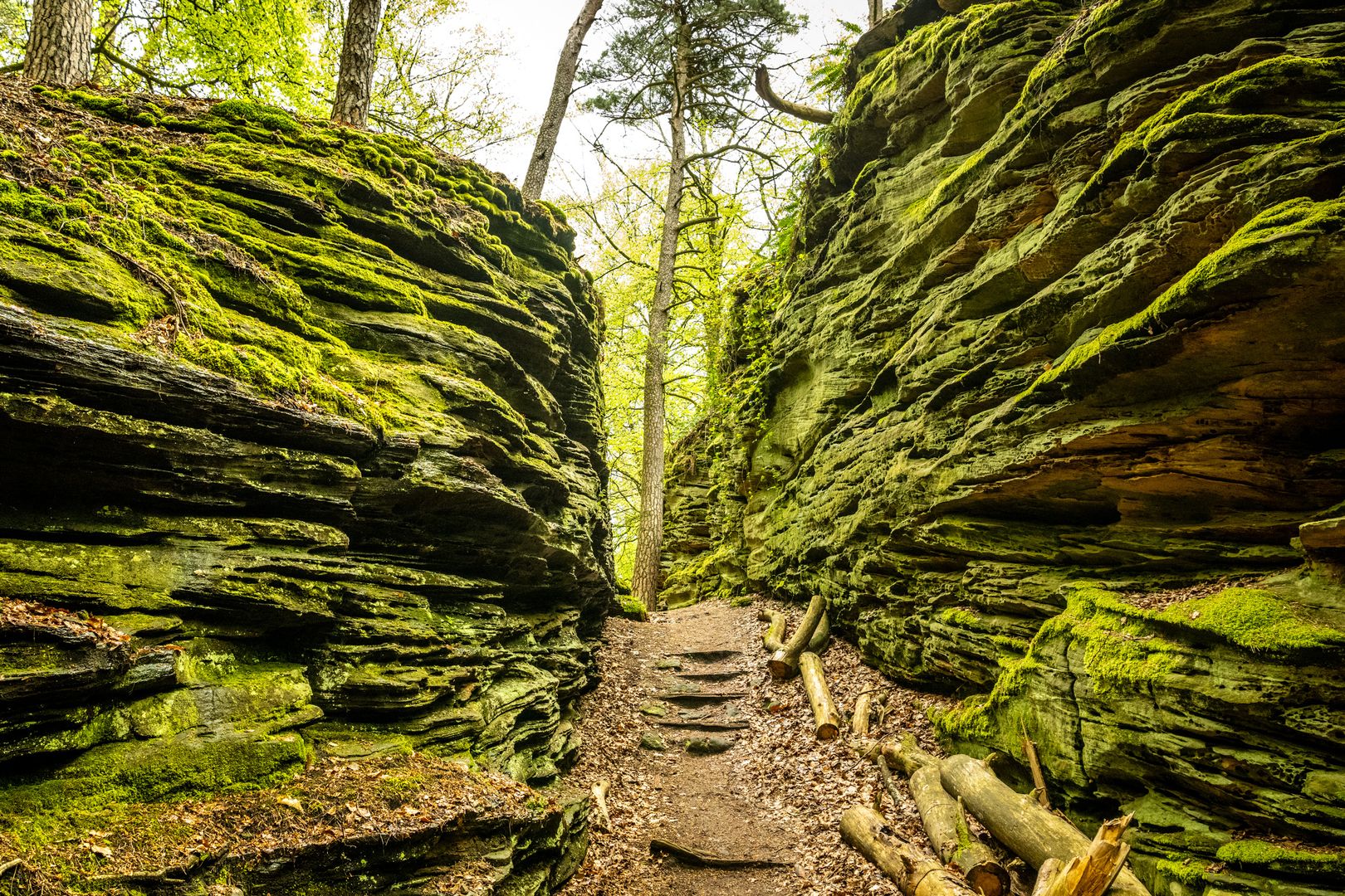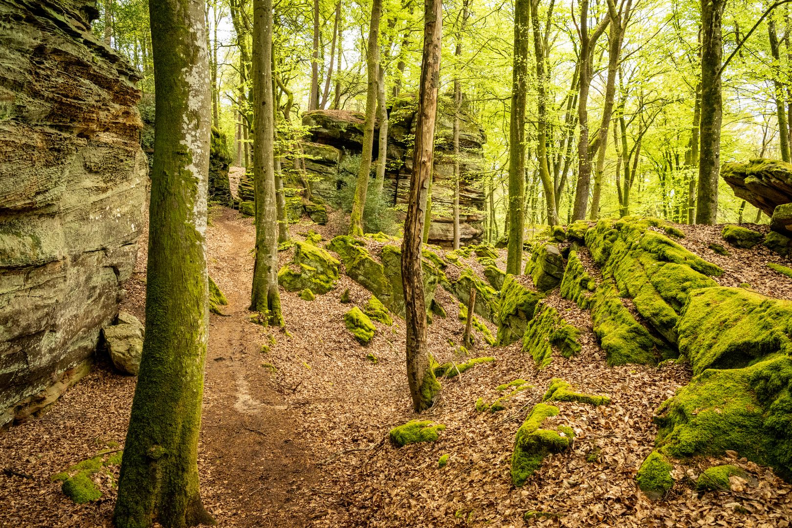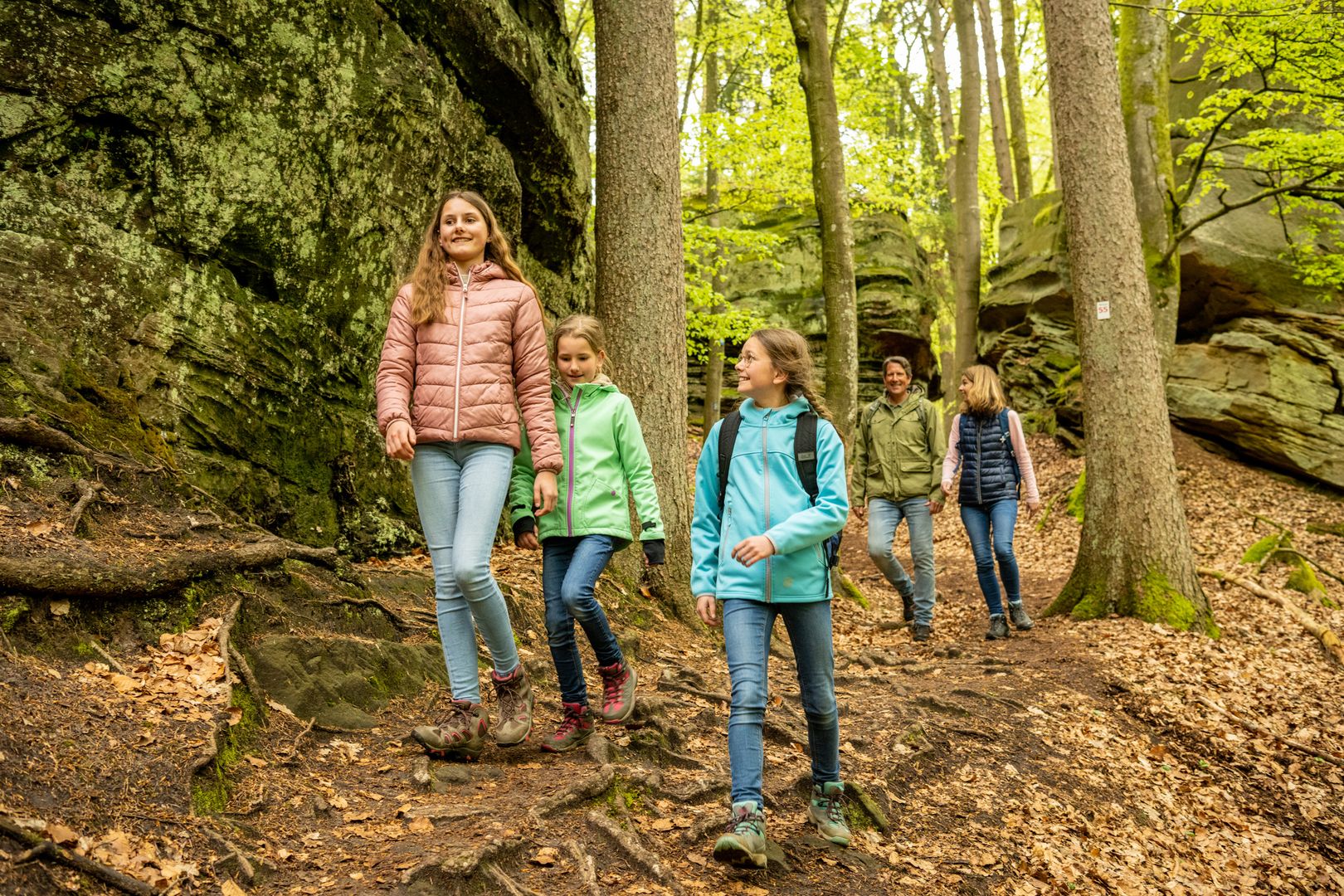 Namensgeber der Tour ist die "Grüne Hölle" eine der beeindruckenden Felsformationen der Südeifel. Zum Ende der letzten Eiszeit sind viele große und kleine Klüfte entstanden. Kaum ein Sonnenstrahl erhellt die Grüne Hölle. Sie ist so grün, weil der Sandstein Wasser aufsaugt wie ein Schwamm - beste Voraussetzungen für Moos, Algen und Flechten.