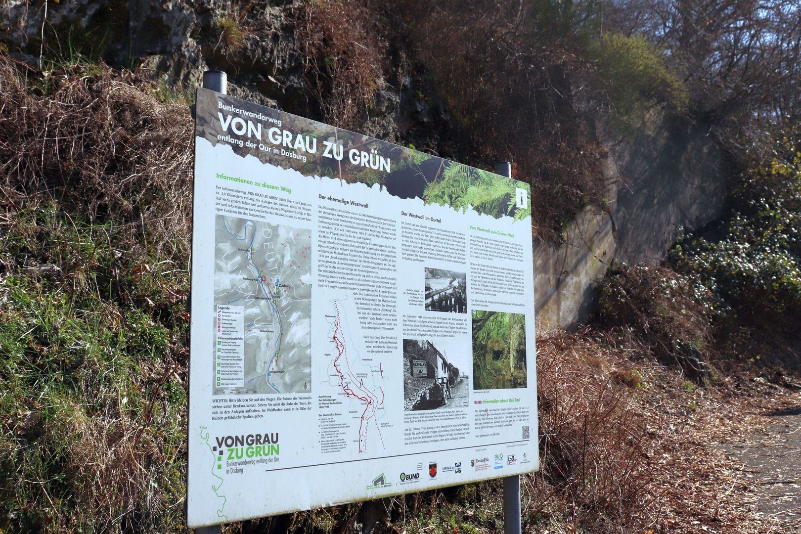 Seltene Tiere und Pflanzen plus Geschichte: Ein Wanderweg entlang des ehemaligen Westwalls aus der NS-Zeit startet im Eifelort Dasburg an der Our. Auf 2,8 Kilometern und 13 Schautafeln erfahren Wanderer die Historie des militärischen Bauwerks, das bis 1940 an der Westgrenze des damaligen Deutschen Reiches gebaut wurde.