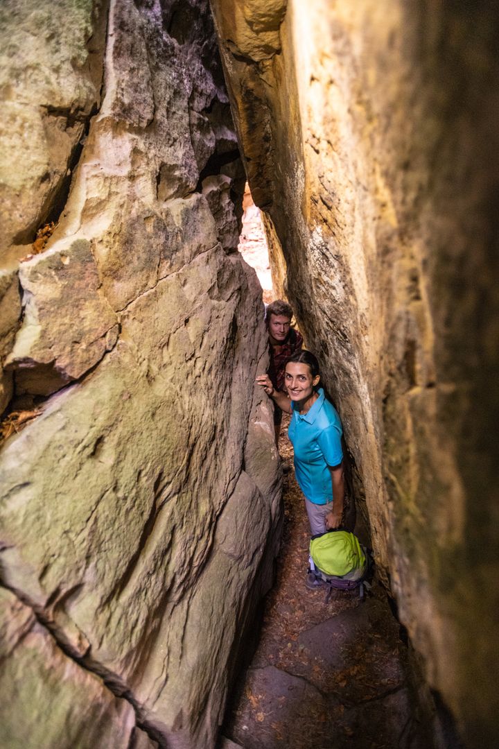 Die spektakulären Felseindrücke setzen sich im Haupeschbachtal fort. Nach jeder Biegung ein neuer Blickwinkel, ein neues Fotomotiv. Über Stege, Stock und Stein geht es mal rechts, mal links des Wassers talwärts bis Grundhof. Dann steigt ihr wieder bergan und erreicht in der Felskulisse einen weiteren Höhepunkt: Die „Mandrack“-Passage. Sie ist im Schulterbereich nur etwa 40 cm breit. Da ist es gut, einen Partner an der Seite zu haben, der schon mal den Rucksack entgegennimmt. Der Felsenweg wendet sich nun talwärts nach Bollendorf, wo ihr auf dem gegenüberliegenden Hang euren Startpunkt wieder erreicht.