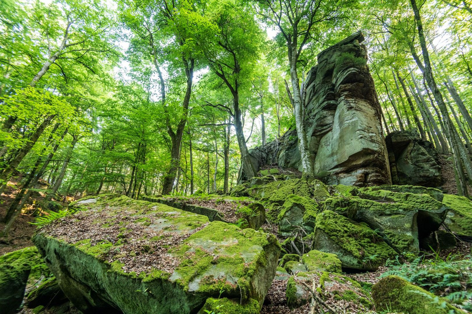 Ihr startet am Sonnenberg über dem Urlaubs- und Grenzort Bollendorf, gewinnt rasch an Höhe und umrundet das Bollendorfer Plateau an seiner spektakulären Südkante. Über euren Köpfen türmen sich zerklüfteten Felsformationen: Nikolauslay, Muhmenlay und Predigtstuhl, umrundet vom sich windenden Steig, dem ihr über in Stein gehauene Stufen folgt. Es ist, als hätte der Teufel beim Zusammenfügen dieser gigantischen Felsblöcke seine Hand im Spiel gehabt: gewaltige Steinklötze, kunstvoll gestapelt und gut ausbalanciert – eingebettet im satten Grün der Farne, Flechten und Moose.