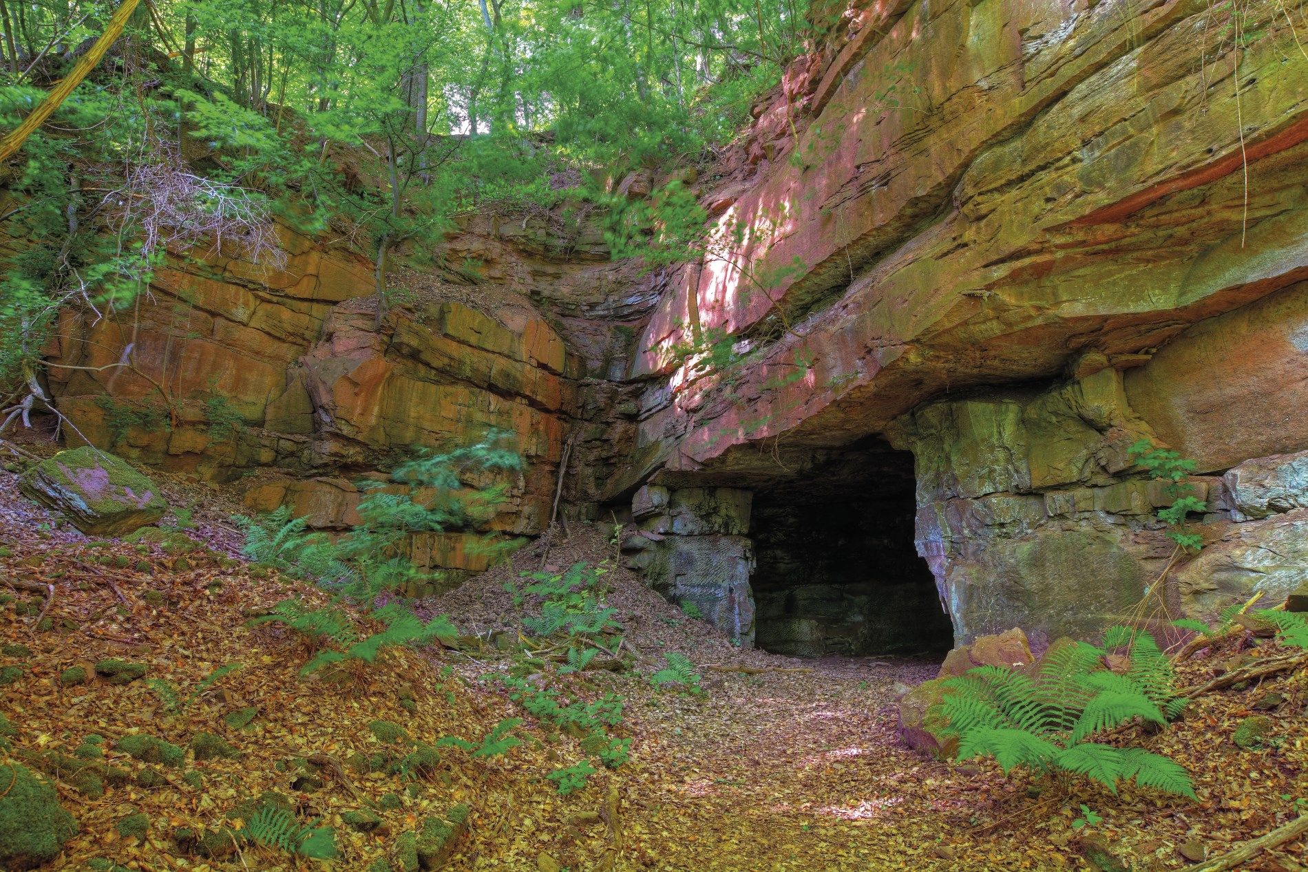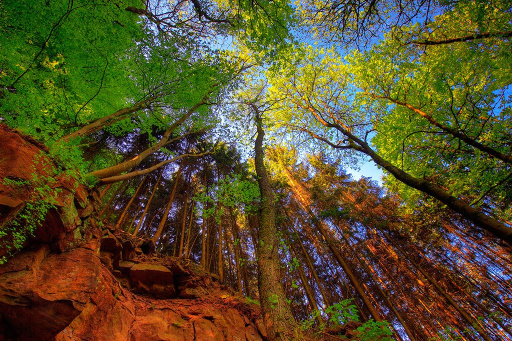 Wie ein rotes Band zieht sich der Eifeler Buntsandstein an der gesamten Wanderung entlang – durch tief eingeschnittene Täler und über sanfte Hochflächen. Mal präsentieren sich die Sandsteinfelsen in mächtiger Schönheit – mal erkennt die Spuren der ehemaligen Steinbrüche als Zeugnisse des traditionsreichen Natursteinabbaus. Über weite Strecken der Hochlagen sind sie von einer zauberhaften Natur überwachsen. Die Wanderwege schlängeln sich durch Laubwälder und vorbei an Feldern, Wiesen, Hecken und Obstbäumen.