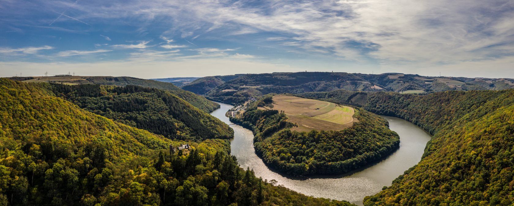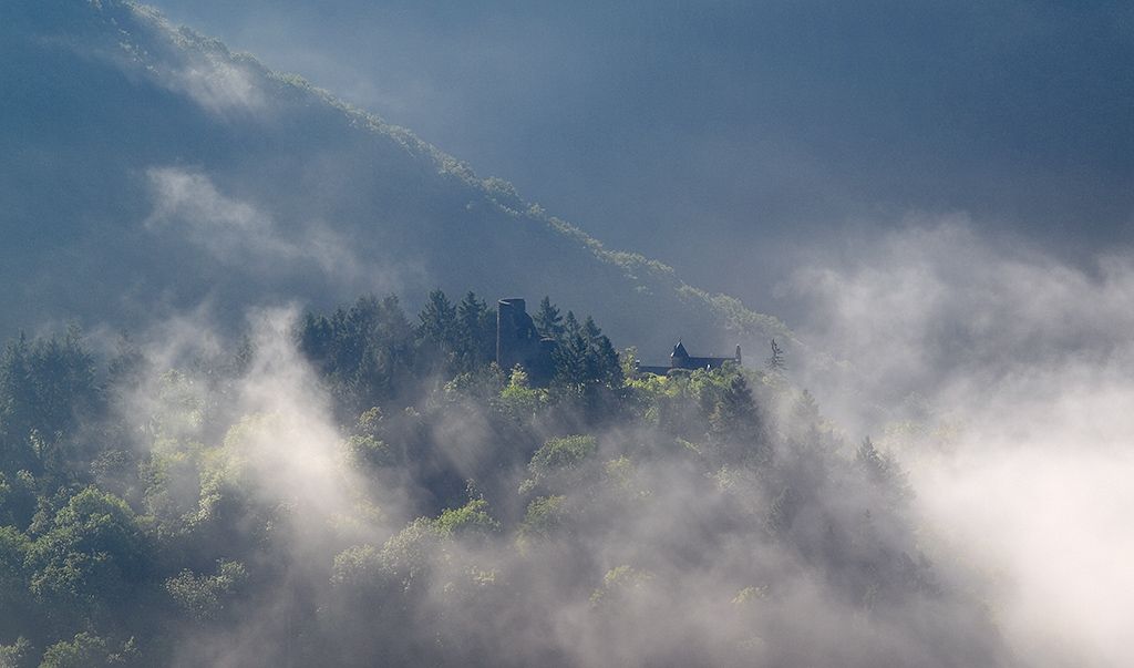 Auf dieser faszinierenden Wandertour im NaturWanderPark delux wartet eine grandiose Landschaftskomposition auf euch! Es ist wohl eines der schönsten Postkartenmotive im NaturWanderPark delux, das sich hier vor euch ausbreitet: Die Ourtalschleife etwas nördlich von Vianden. Im Tal liegt der Ort Bivels mit der markanten blauen Brücke, darüber die bewaldete Kuppe mit einer hellgrünen Tonsur, umrundet vom tiefen Blaugrün der breit aufgestauten Our, eingefasst von steil aufstrebenden Eichenwäldern. Und mittendrin die auf einem mächtigen Schiefersporn thronende Ruine Falkenstein. Sie ist die erste, die sich aus dem Nebel schält, wenn die Morgensonne das Ourtal flutet. Auch wenn ihr dem Aufbruch entgegenfiebert, so sucht zur Einstimmung auf die Tour den Aussichtsplatz an der Grillhütte Waldhof-Falkenstein auf – hinreißend! Alternativ könnt ihr die Nat’Our Route von hieraus über einen kurzen Zuweg erreichen und runden, offiziell startet sie in Bivels.
