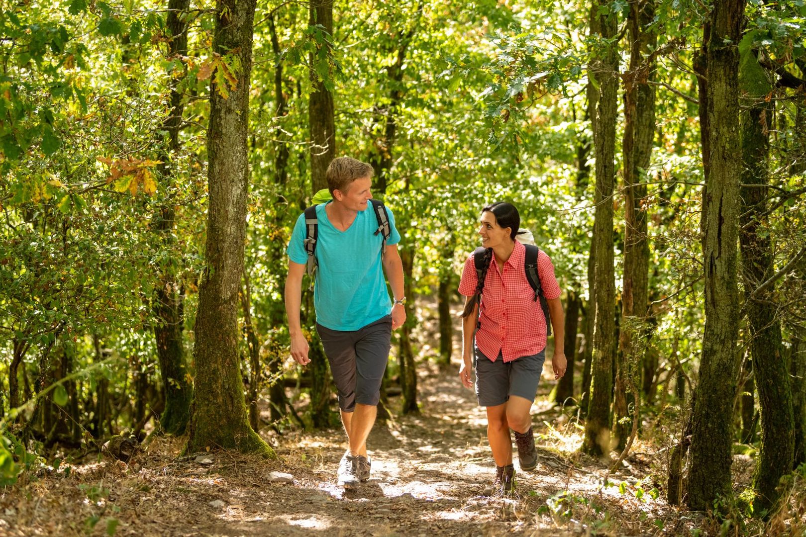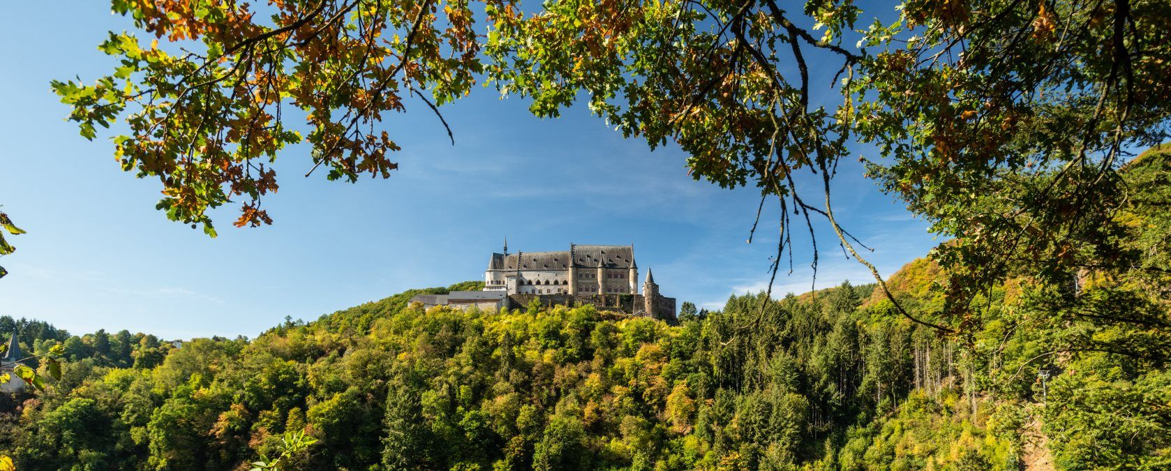 Die Nat‘Our-Route 5 startet im mittelalterlichen Vianden, etwas südlich der sehenswerten St. Rochus Kirche, die deutlich von der Staumauer überragt wird. Ihr wendet euch bergaufwärts in Richtung des wiederaufgebauten Schlosses von Vianden, eine der bedeutsamsten und mächtigsten Burgen Europas. Das Schloss ist allemal einen mehrstündigen Besuch wert. Jetzt lasst ihr es links liegen, gewinnt über Serpentinen rasch an Höhe und erreicht die Bergstation des Viandener Sessellifts. Von hier geht es nun etwas gemütlicher durch lichten Mischwald zur Bildchenkapelle, von der aus ihr eine herrliche Aussicht über die aufgestaute Our und ihr Tal habt. Bergab umrundet ihr die aus dem Berg ragende Turbine 10 und erreicht die „Ourdall-Promenade“, der ihr bis zur blauen Brücke hinter Bivels folgt. Hinter der Brücke seid ihr nun auf deutschem Boden. Bergan führt ein Waldweg zum Felssporn, auf dem die Ruine Falkenstein thront. Die Burg kann nicht betreten werden, allerdings bietet ein kleiner Pavillon vor dem trutzigen Eingangsportal bezaubernde Dornröschen-Romantik mit Burgblick.
