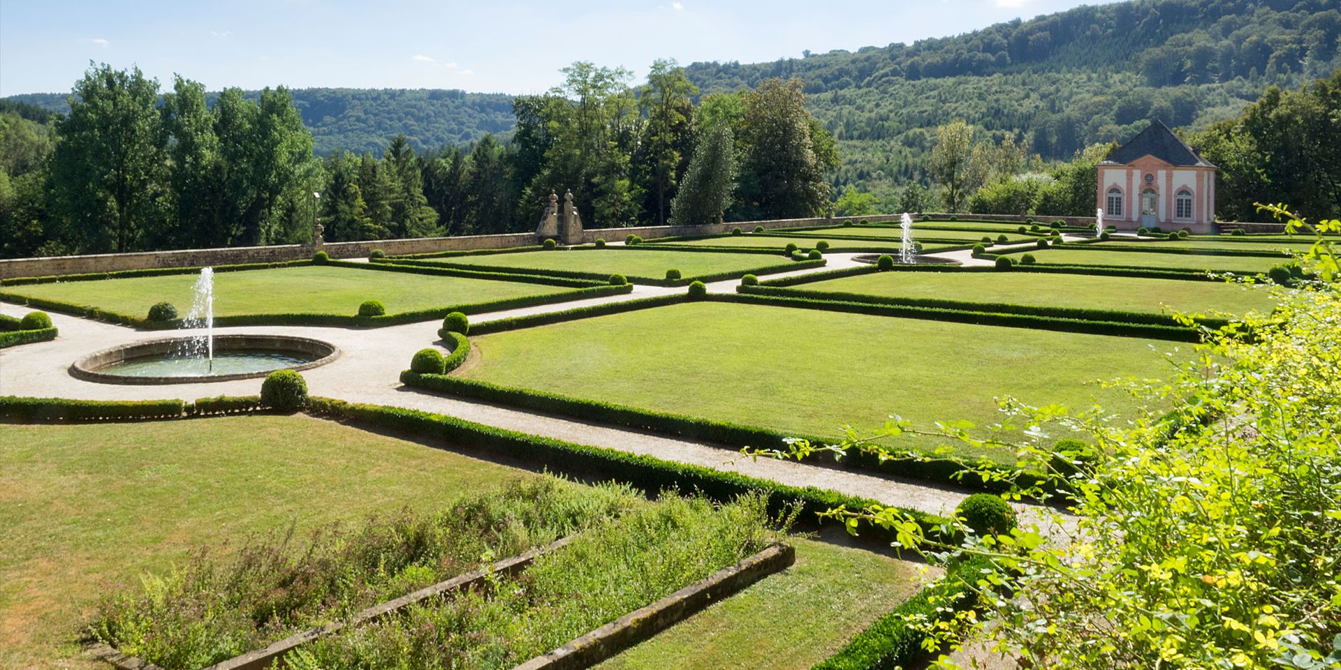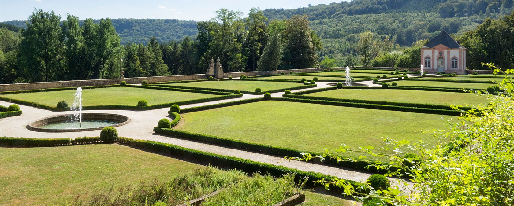 Start- und Endpunkt der Rundwanderung ist das Schloß Weilerbach mit seinem sehenswerten Garten.