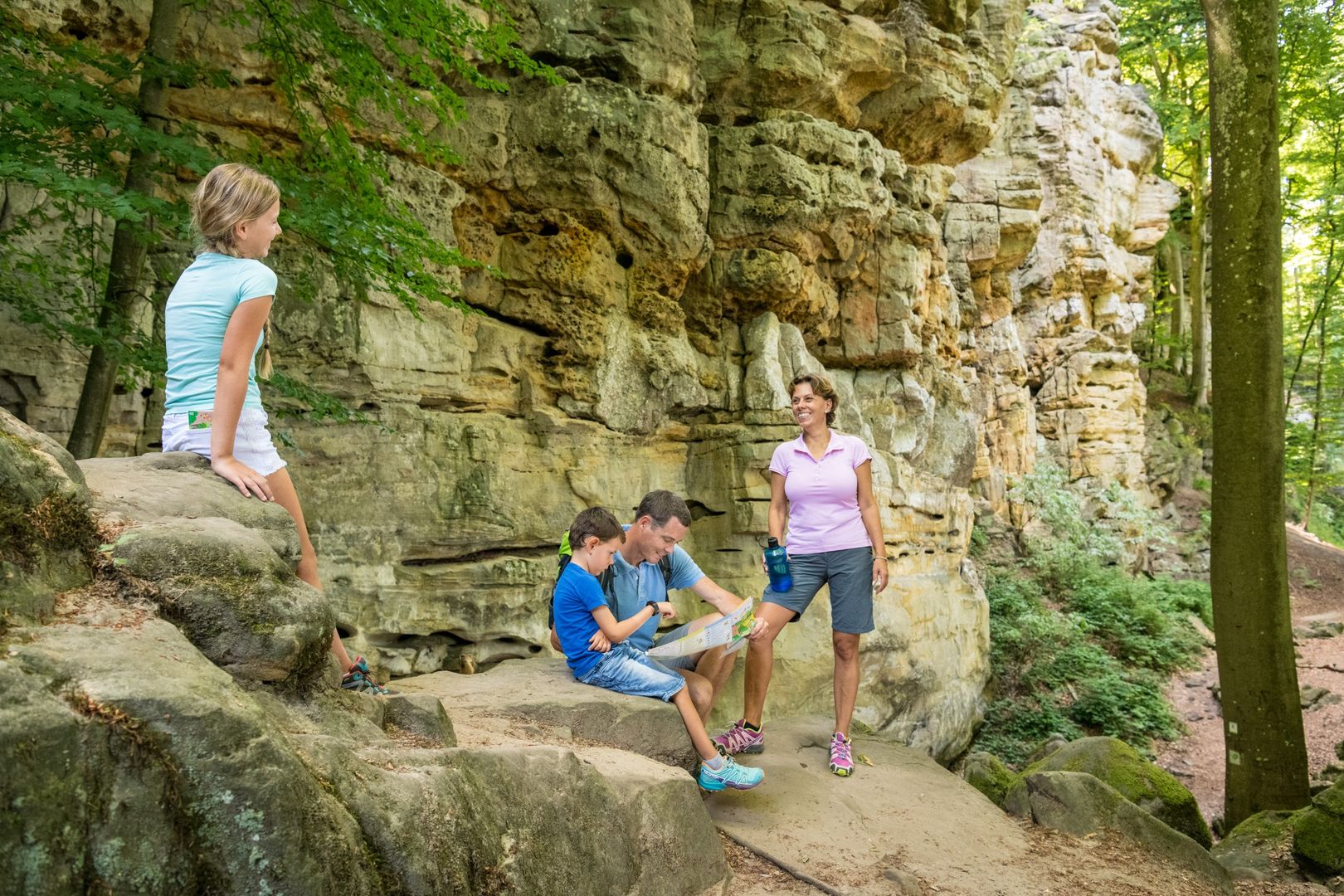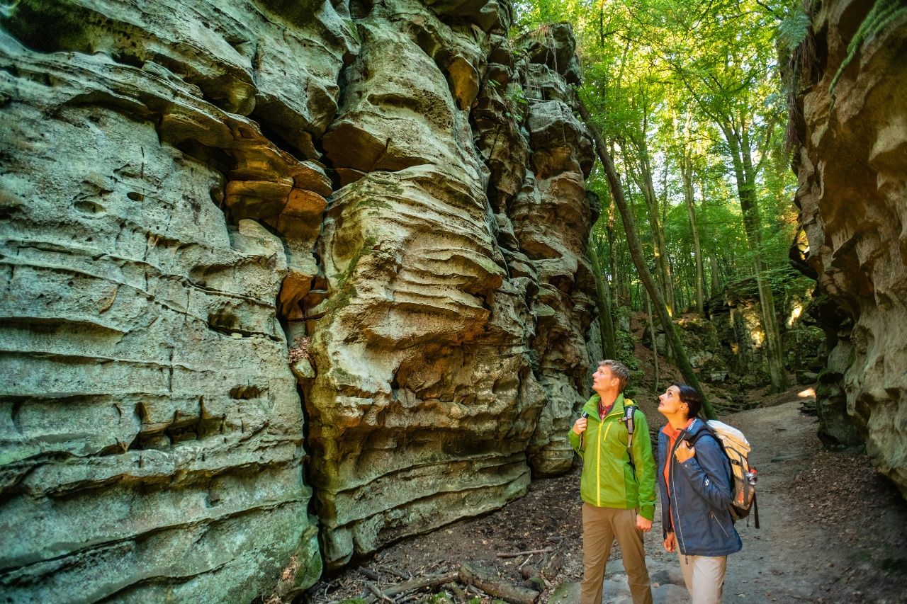 Start und Ziel dieser Felsentour, die auch größere Kinder gut bewältigen können, ist das Naturparkzentrum Teufelsschlucht. Folgen Sie der Markierung - ein weißes Teufels-"T" auf rotem Grund - und Sie erreichen bald die Teufelsschlucht: ein Nadelöhr im Sandstein, das seinen Namen verdient hat, und der Einstieg in eine faszinierende Felsenwelt.