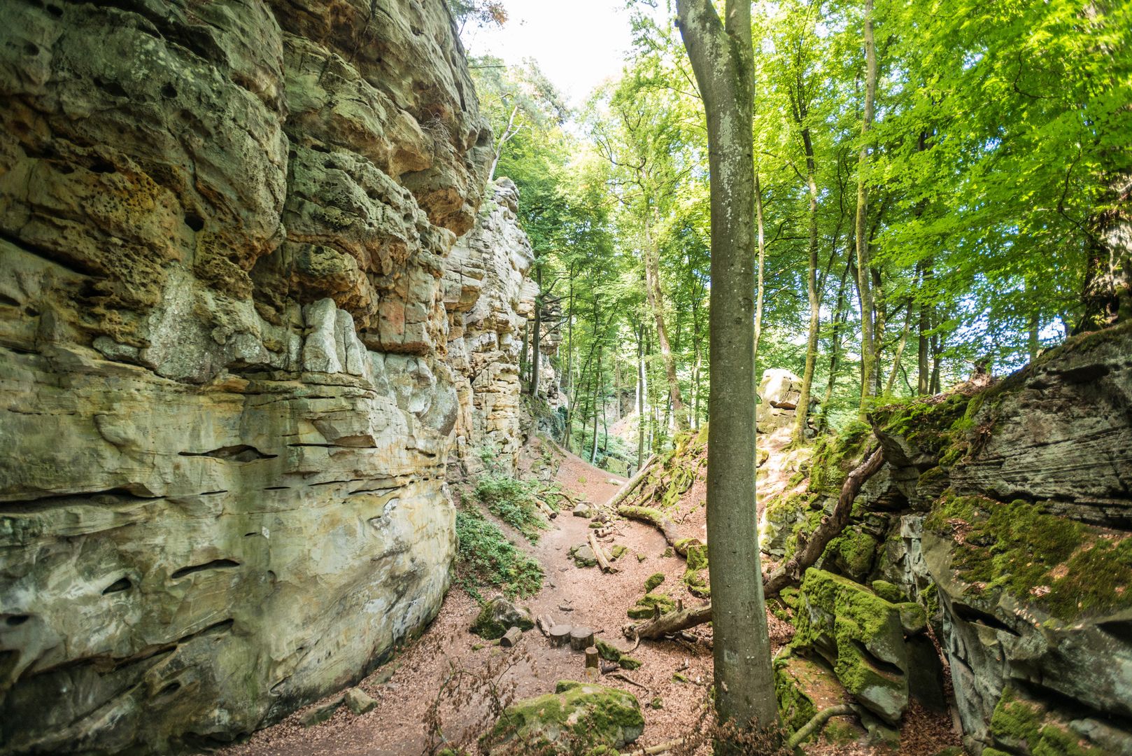 Schiefe und krumme Stufen führen hinab in die kühle, feuchte Schlucht. Vorsicht, kurz den Kopf einziehen und durch die enge Stelle quetschen! Kaum zu glauben, dass dieser Sandstein einst ein Meeresboden war... Weiter geht's auf einem Steg und dann wieder viele Stufen hinab, bis sich der Blick ins bewaldete Tal öffnet.