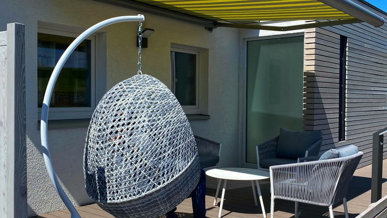 Auf unserer Terrasse finden Sie wunderschöne Lounge-Möbel, die zum Entspannen und Verweilen einladen. Genießen Sie die frische Luft und den herrlichen Ausblick auf die umliegende Natur. Zudem bieten wir Ihnen zwei elektrische Markisen, die Ihnen Schutz vor Sonne bieten.