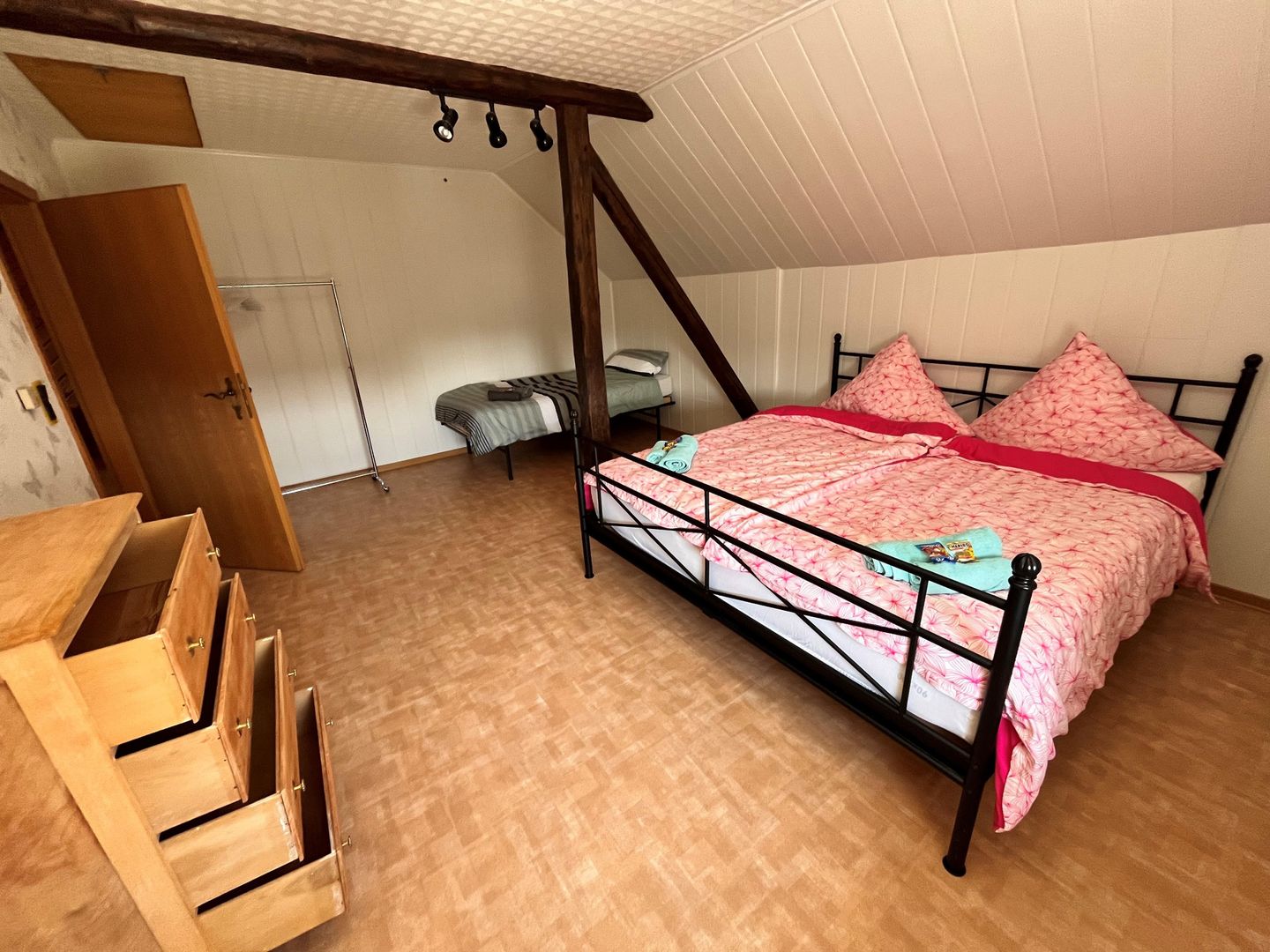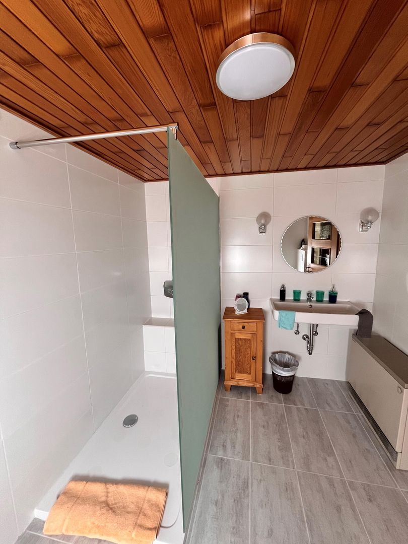 Modern, hell und mit viel Liebe zum Detail eingerichtet – 2 getrennte Schlafzimmer, ein Bad und viel Platz zum Wohnen, Kochen und Essen, sowie eine große Wiese mit Obstbäumen an einer kaum befahrenen Straße.