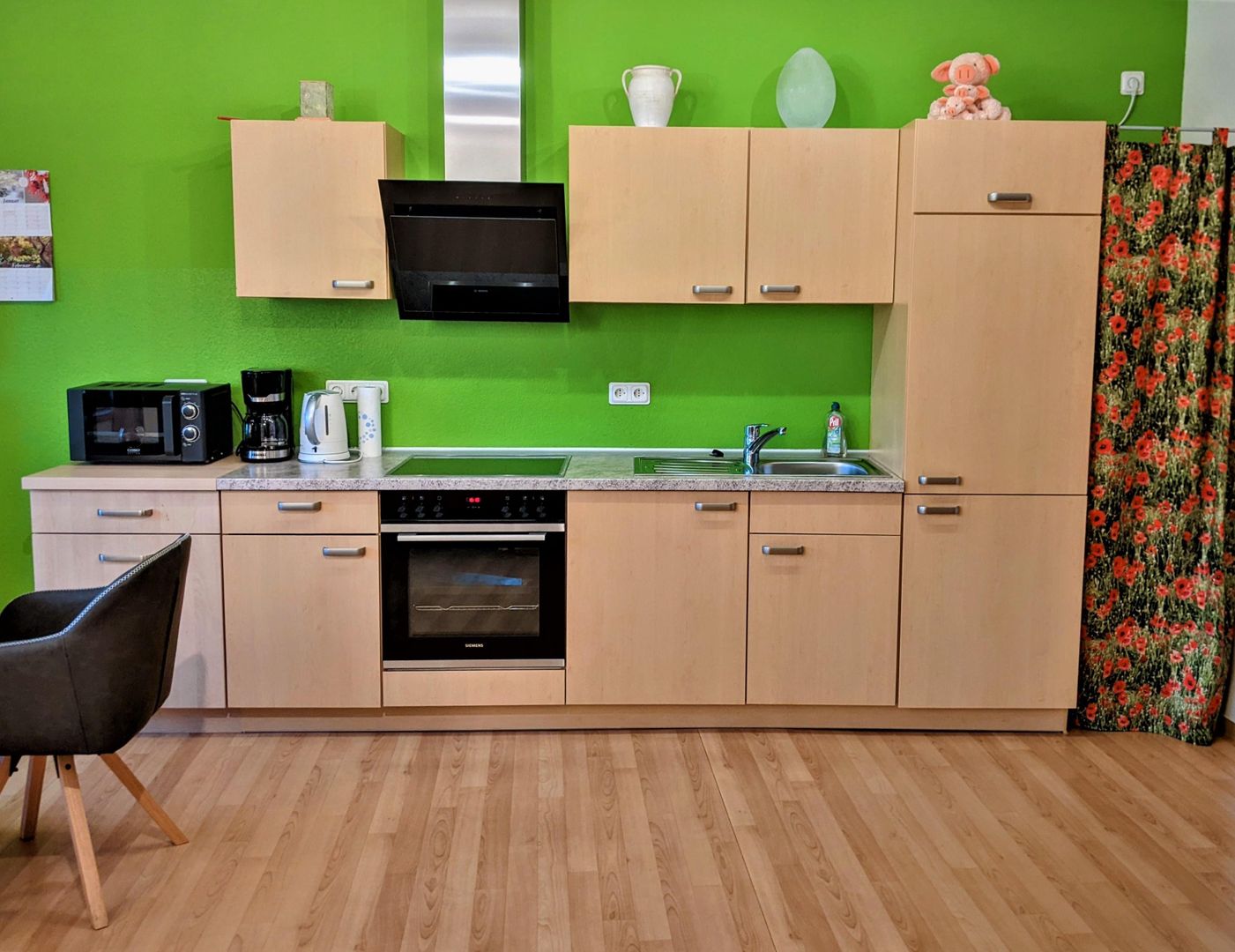 Auf ca. 40 m² mit separatem Eingang steht Ihnen ein heller Wohn- und Schlafraum mit komplett eingerichteter Küchenzeile, TV und Kompaktanlage, Bad mit Dusche und WC und ein großer Balkon (5 x 1,5 m) zur Verfügung.