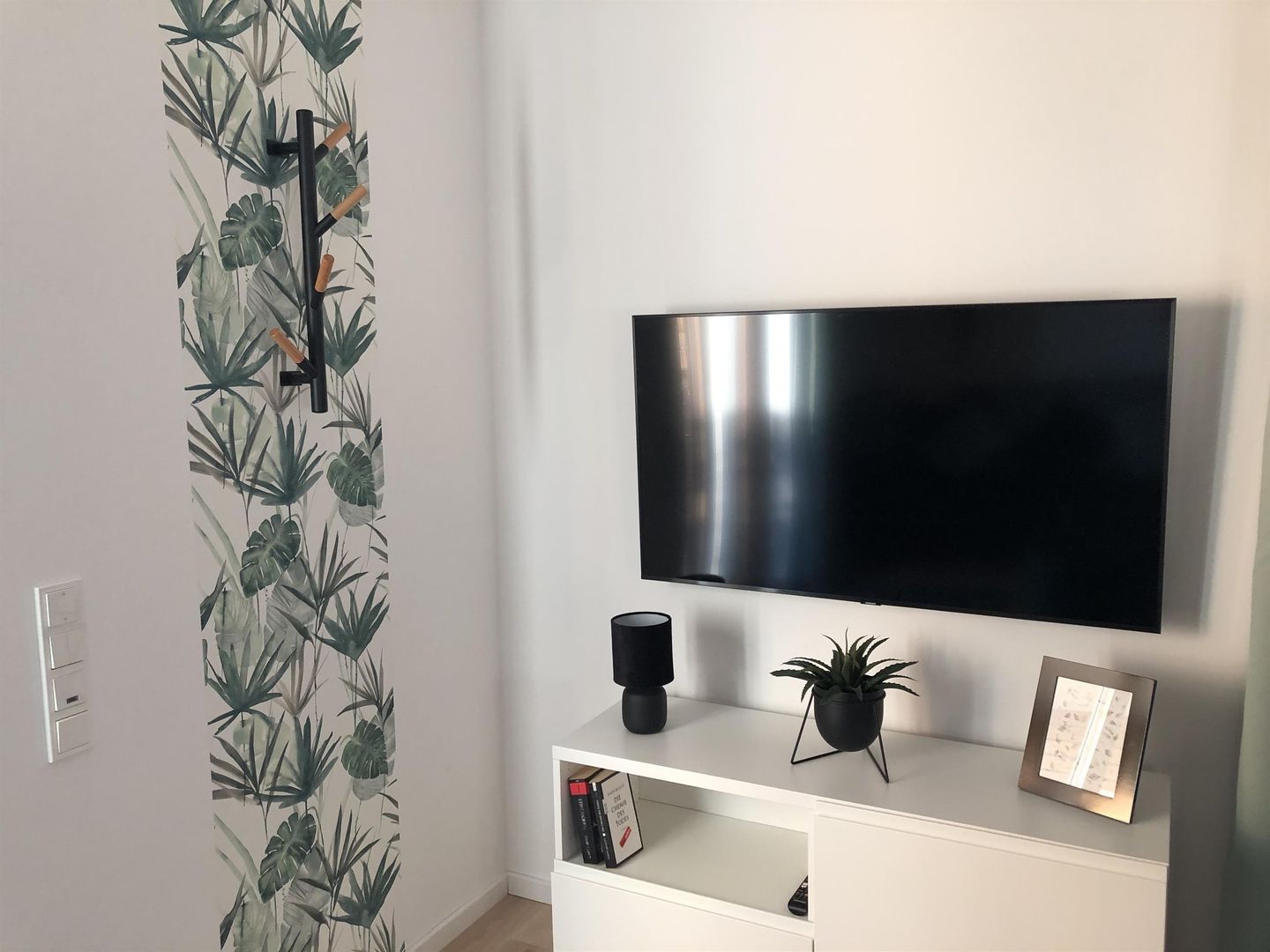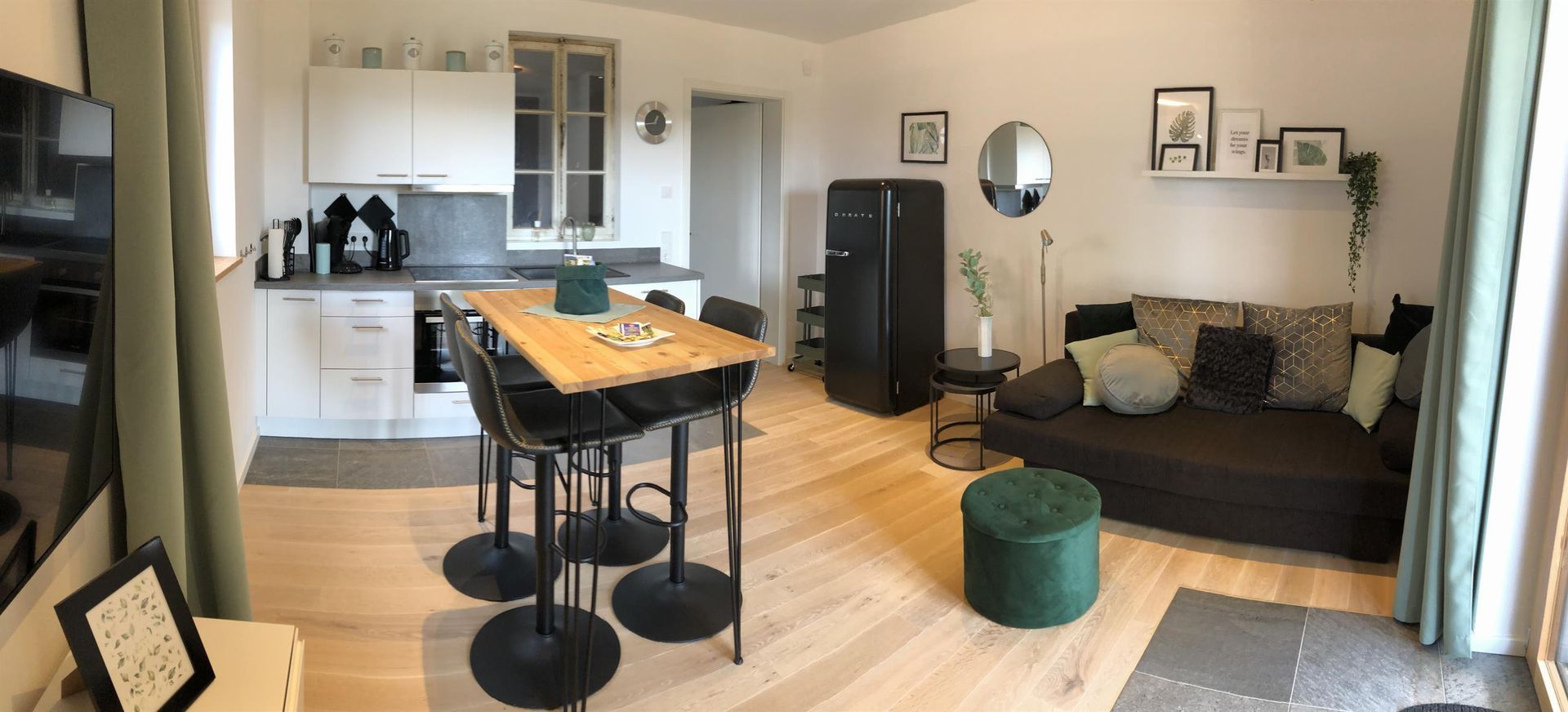 Der Wohnraum ist mit einer gemütlichen Couch und einem großen Flachbild-TV ausgestattet. Die im Wohnraum offene Küche ist sehr gut ausgestattet und komplett eingerichtet mit Spülmaschine, Herd mit Backofen und Ceranfeld, Kaffeemaschine (Pad), Wasserkocher, Essplatz mit bequemen Barhockern, Retro-Kühlschrank mit separatem Gefrierfach.