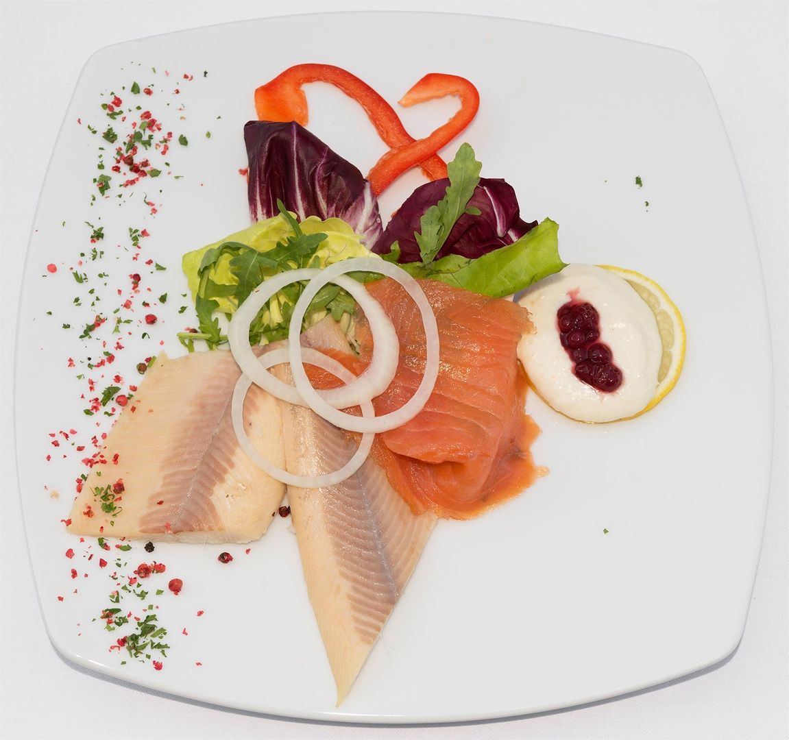 • Ein ansprechend angerichteter Fischteller mit verschiedenen Fischsorten, frischen Salatblättern und einer Zitronenscheibe. Dazu sind rote Paprikastreifen und eine kleine Portion Sauce dekoriert.