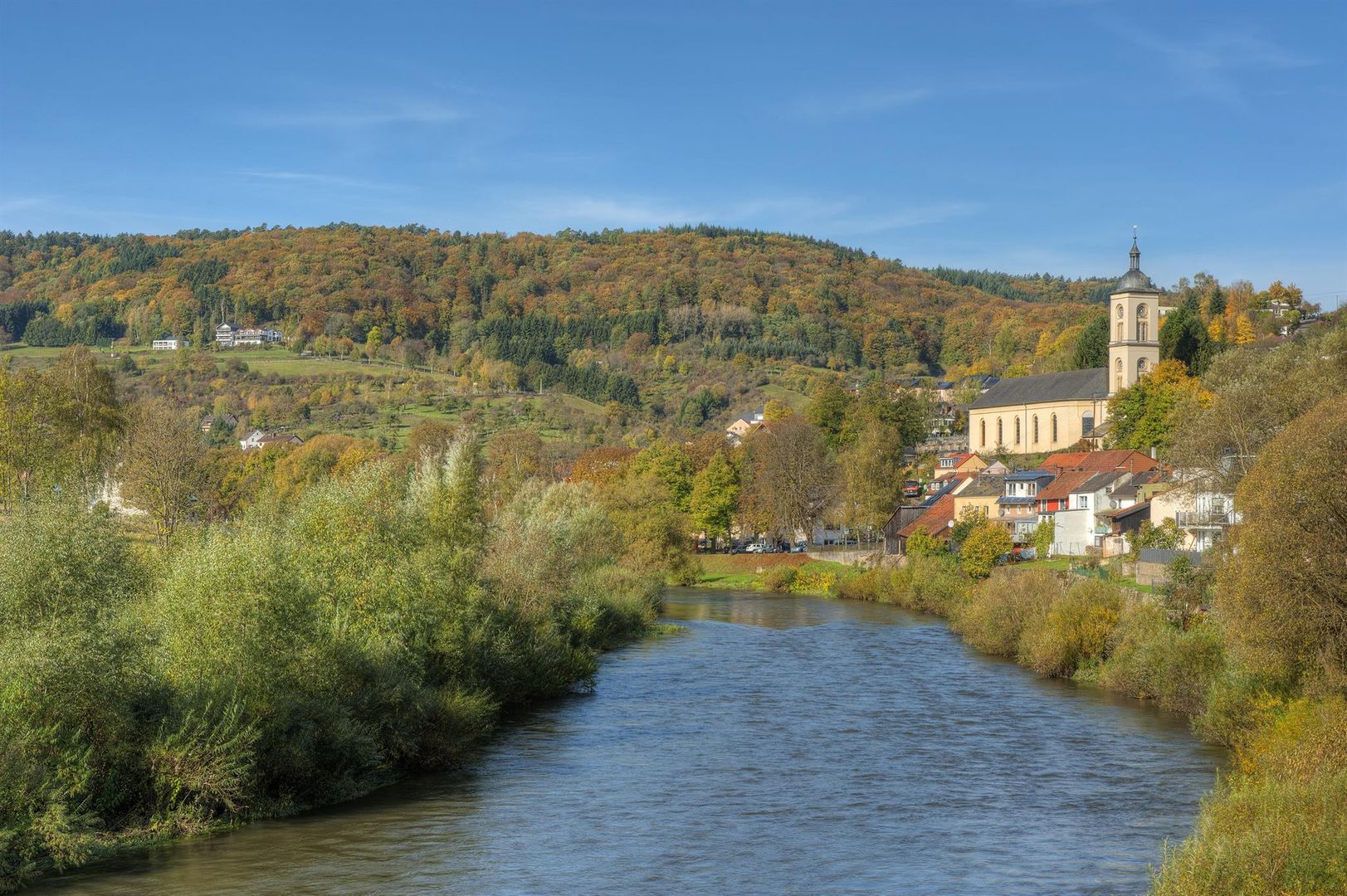 • Ein ruhiger Fluss fließt durch eine malerische Landschaft mit bunten Bäumen im Hintergrund. Im Bild ist eine kleine Stadt mit einer Kirche zu sehen.