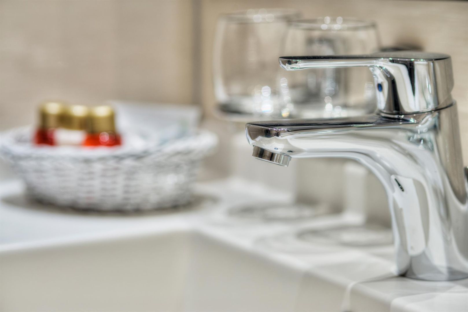 • Ein moderner Wasserhahn in einem Badezimmer. Im Hintergrund sind Gläser und ein Korb mit kleinen Flaschen zu sehen.