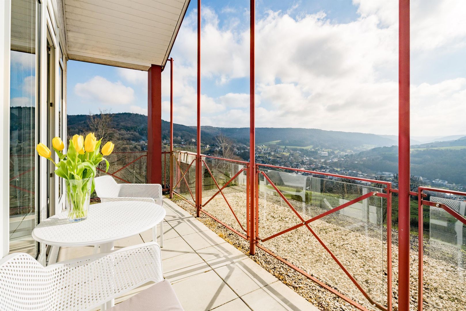 • Ein sonniger Balkon mit einem weißen Tisch und Stühlen. Im Hintergrund erstreckt sich eine malerische Aussicht auf grüne Hügel und einen bewölkten Himmel.