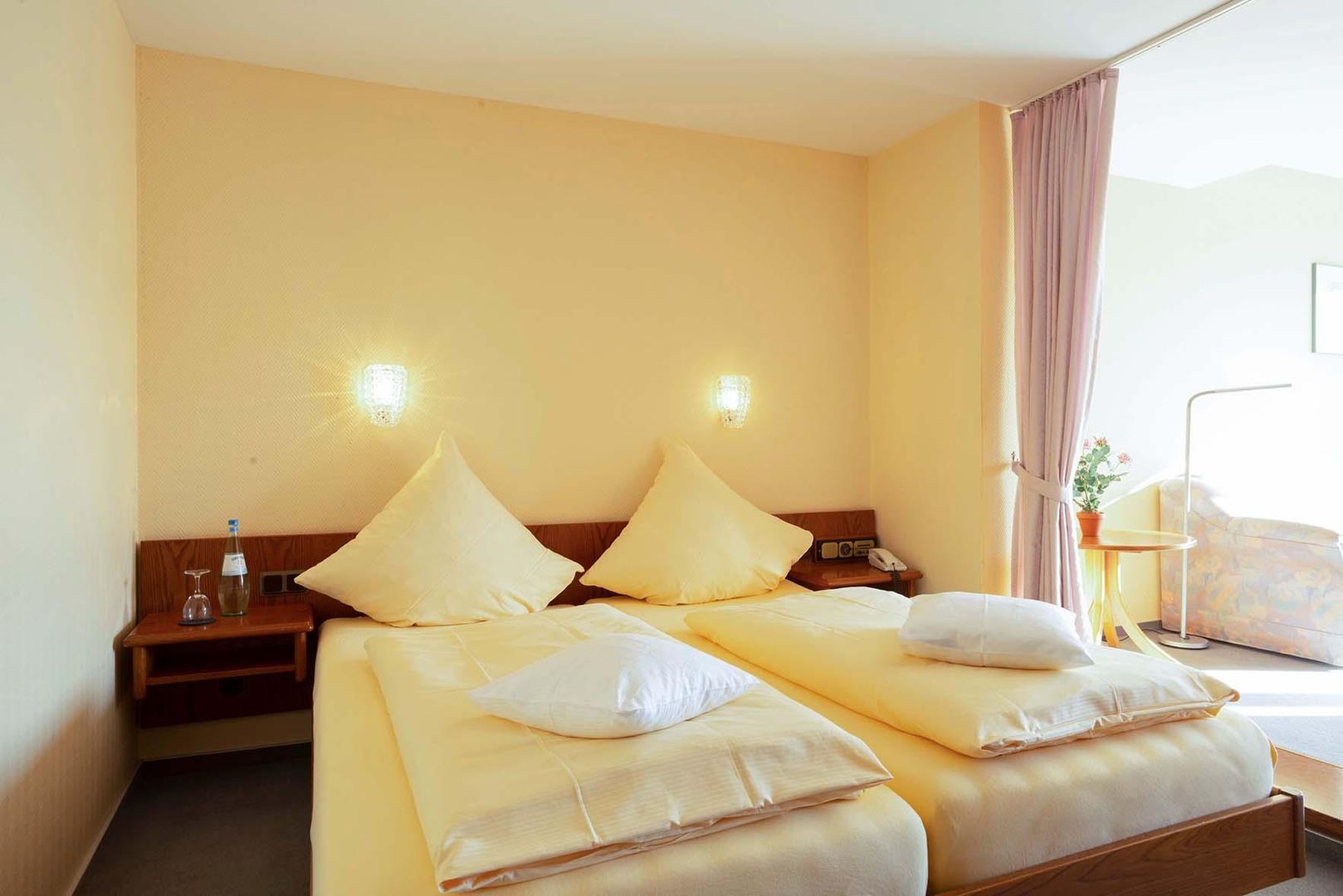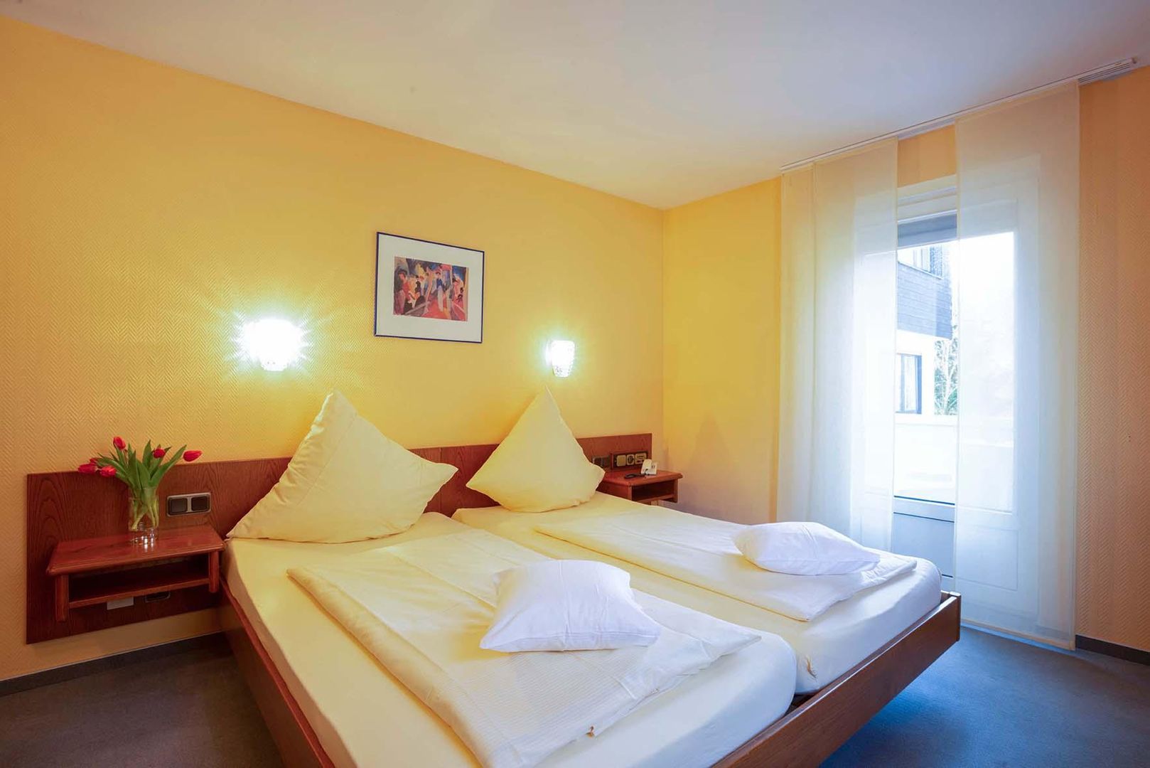 • Ein helles Zimmer mit zwei Einzelbetten und gelben Wänden. Es gibt eine große Fensterfront und eine Blumendekoration auf dem Tisch.
