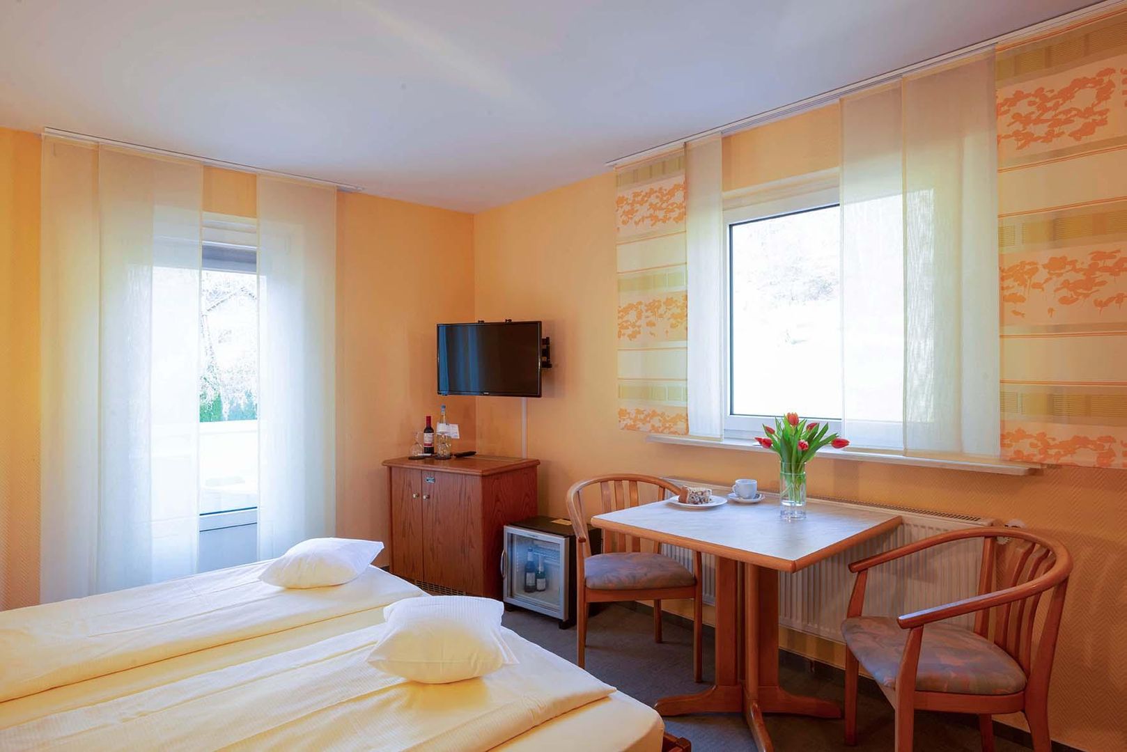 • Ein gemütliches Hotelzimmer mit zwei Einzelbetten, einem Fernseher und einem kleinen Tisch. Große Fenster lassen viel Licht herein und die Wände sind in warmen Farben gestrichen.
