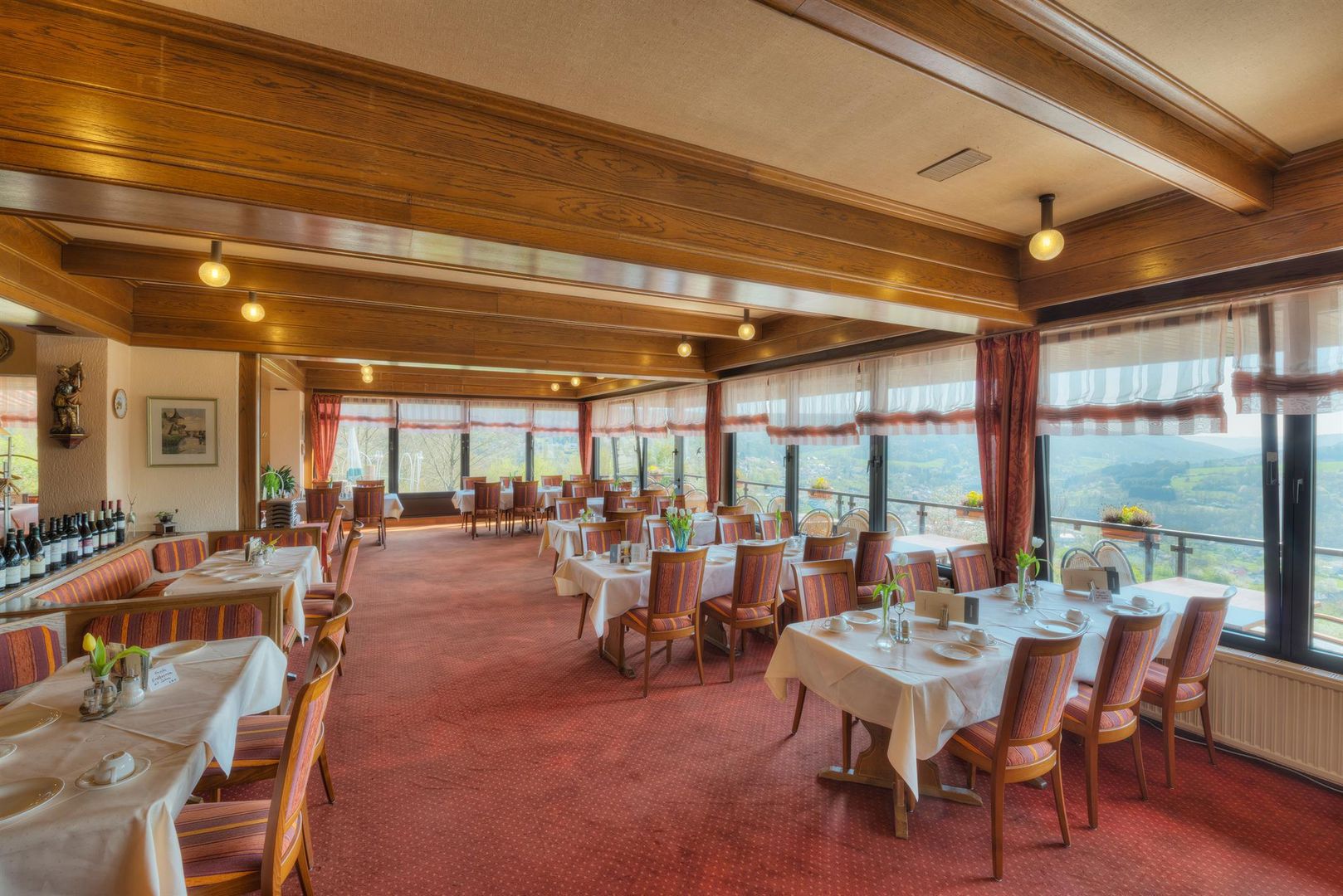 • Ein elegantes Restaurant mit Holzelementen und großen Fenstern. Es sind gedeckte Tische und Stühle auf rotem Teppich zu sehen.