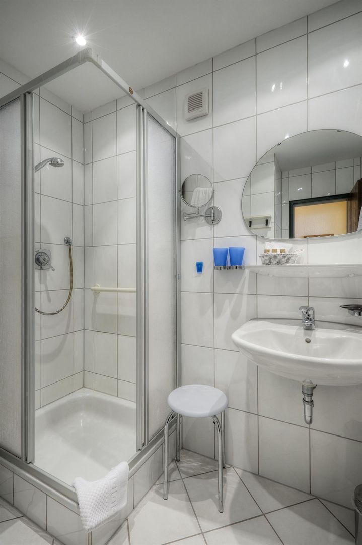 • Ein modernes Badezimmer mit einer Duschkabine und einem Waschbecken. Weiße Fliesen und ein runder Spiegel vervollständigen das Design.