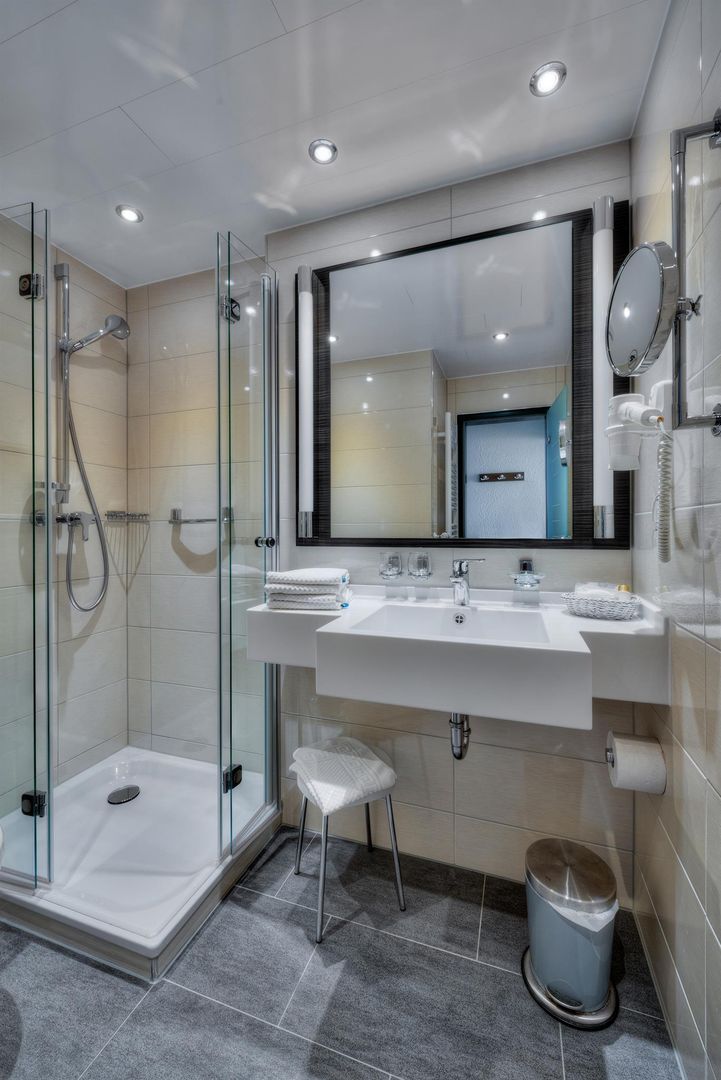 • Ein modernes Badezimmer mit einer Glasdusche und einem schlichten Waschbecken. Der Raum ist hell und gut beleuchtet.