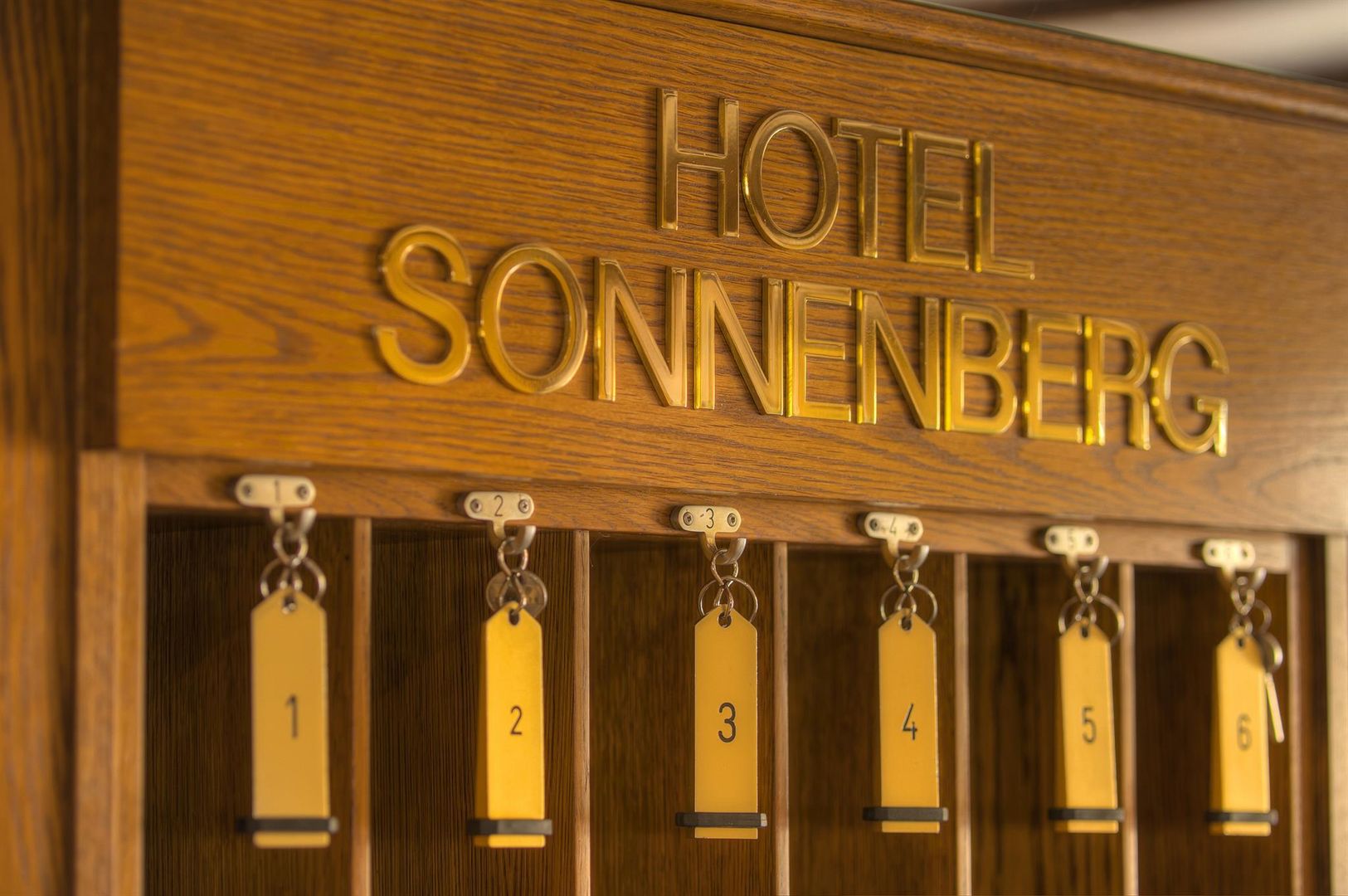• Ein eleganter Empfangsbereich des Hotels Sonnenberg mit schlichten Schlüsselanhängern. Die Holztäfelung verleiht dem Raum einen warmen und einladenden Charakter.