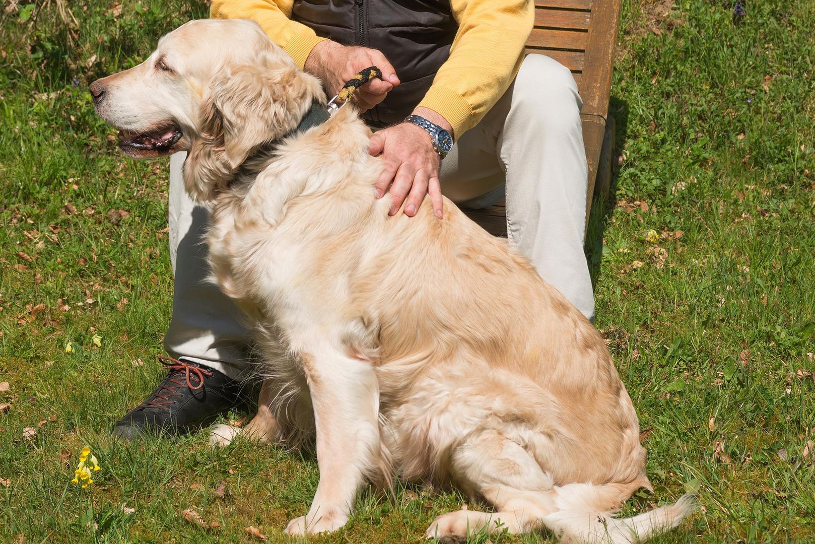 • Ein golden retriever sitzt neben einem Mann im Freien. Es ist ein sonniger Tag und die Umgebung ist grün und ruhig.