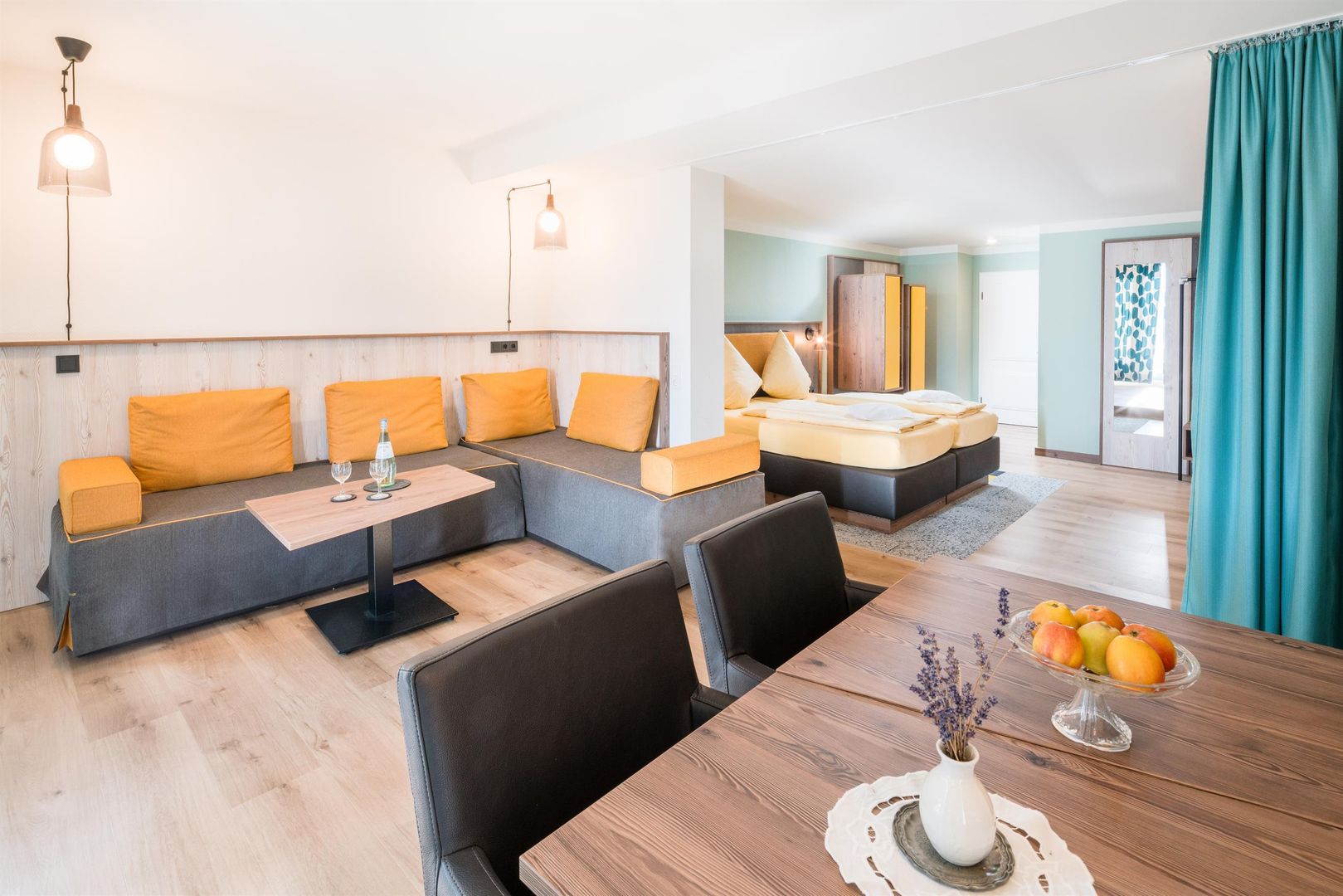 • Ein gemütliches Schlafzimmer mit zwei Einzelbetten und gelben Bettbezügen. Die Wände sind hell und die Einrichtung ist modern und schlicht.