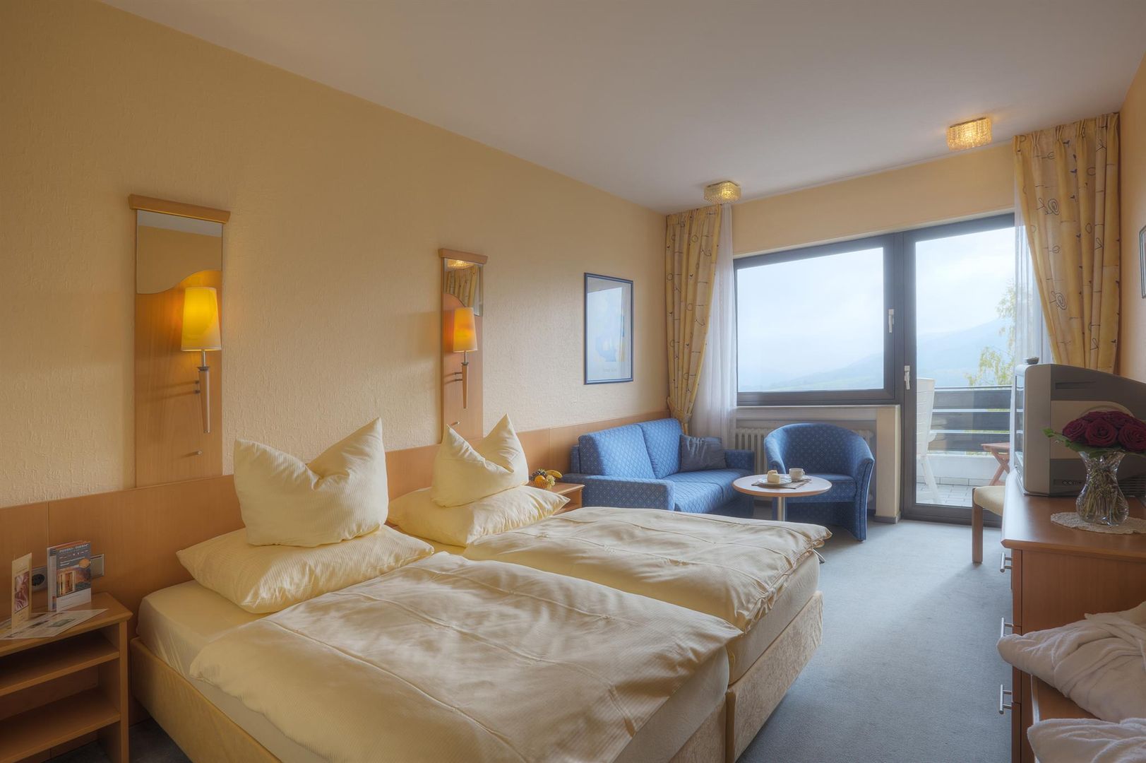 • Ein gemütliches Hotelzimmer mit zwei Betten, einem Tisch und einer Sitzgelegenheit. Auf dem Tisch steht eine Vase mit frischen Blumen.