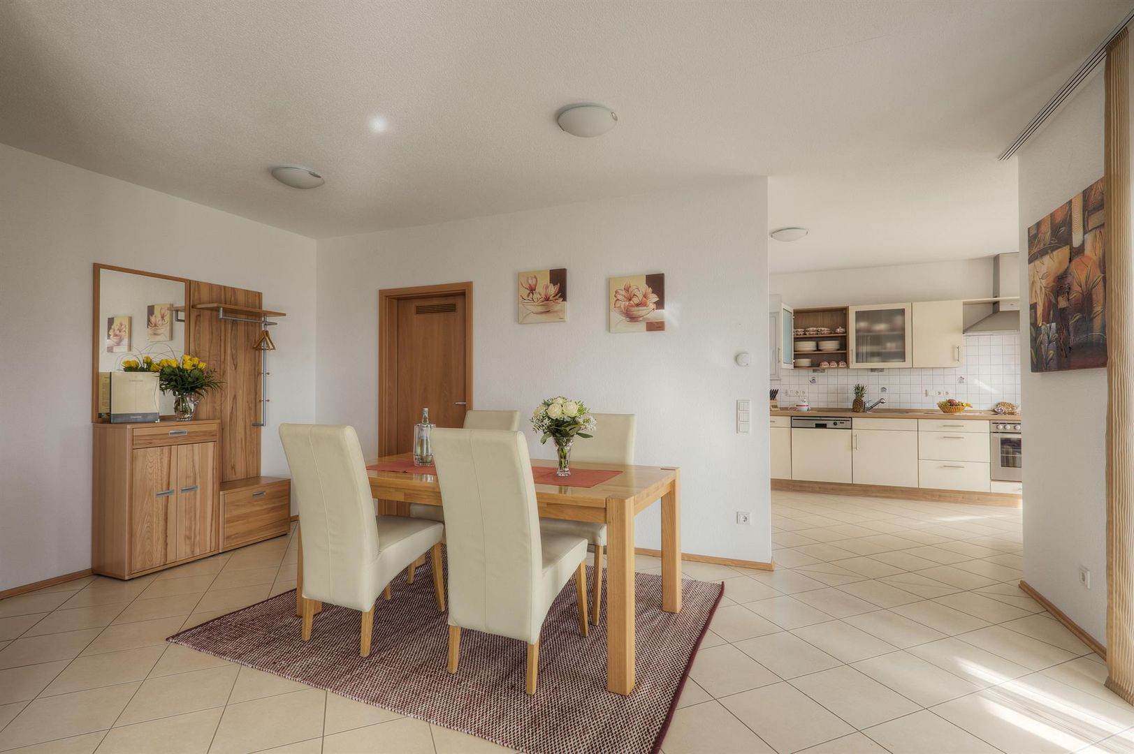 • Ein heller Essbereich mit einem Holztablett und weißen Stühlen. Die offene Küche im Hintergrund ist modern und gut ausgestattet.