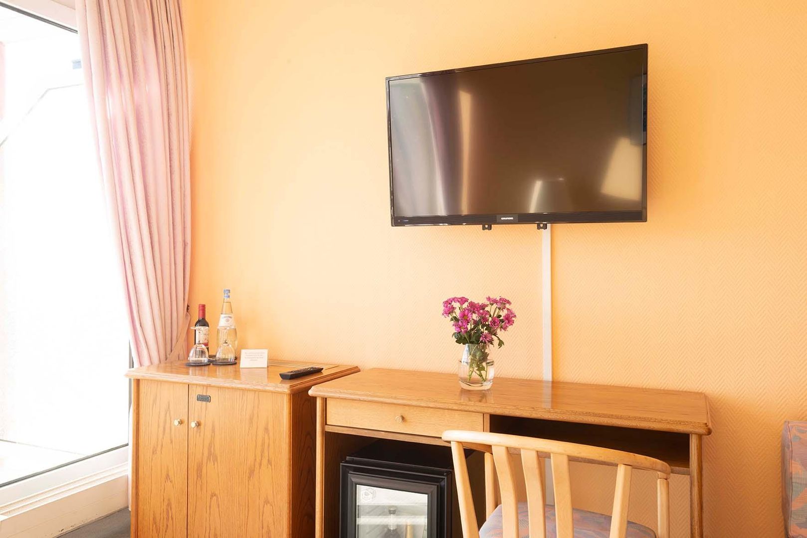 • Ein gemütlicher Raum mit einem Fernseher an der Wand und einem Holztisch. Auf dem Tisch steht eine Vase mit Blumen und daneben ein Kühlschrank.