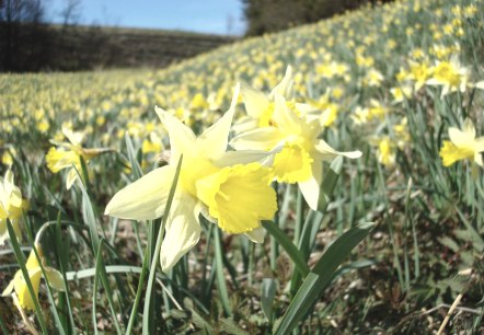 Rund sechs Millionen wild wachsende kleine Narzissen breiten sich zu großen gelben Teppichen aus und kündigen den Frühling an.